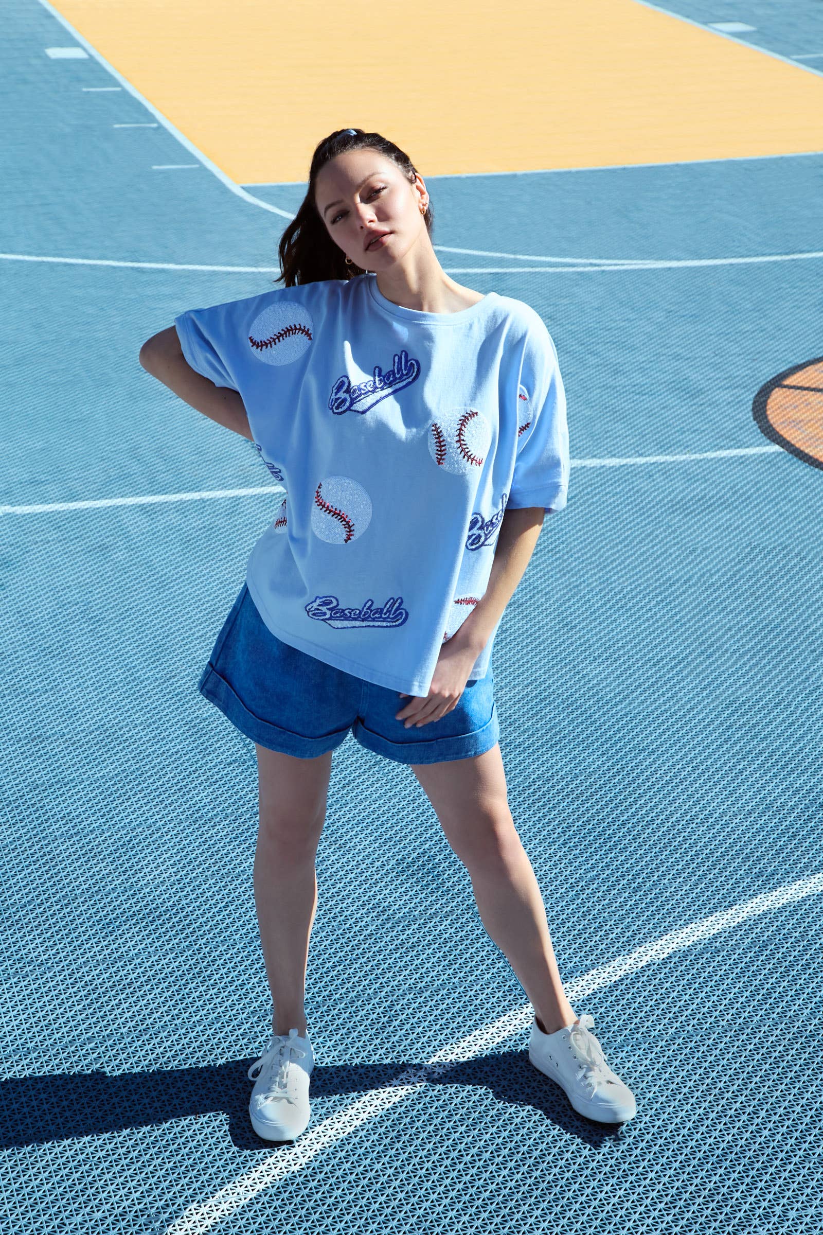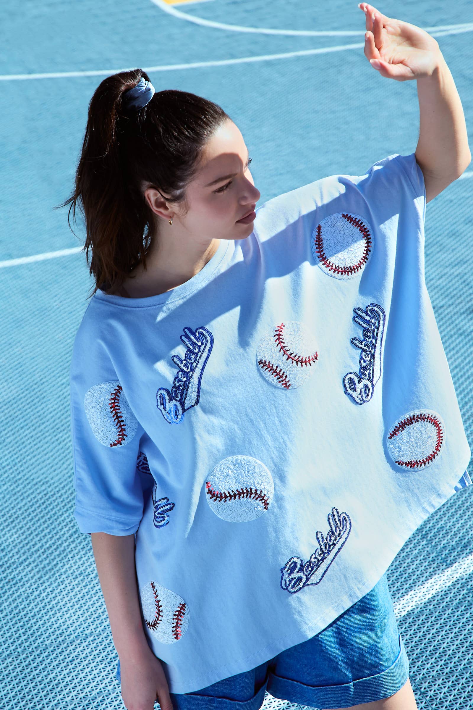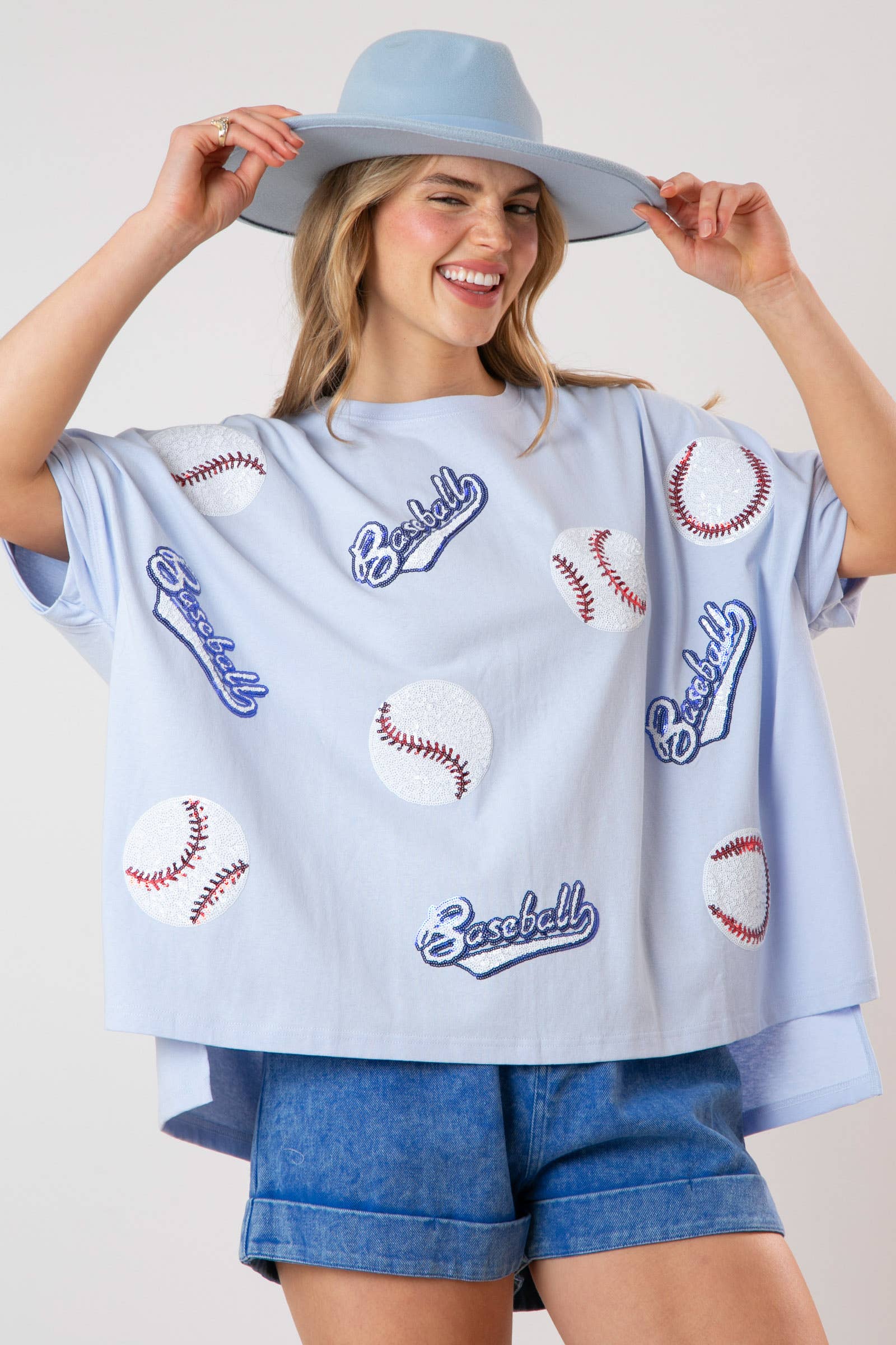 Baseball Sequins Short Sleeve Top - Short sleeves - Loose fit - Sequin baseball embellishments - Asymmetric high-low cut Red: 100% Cotton Made in China