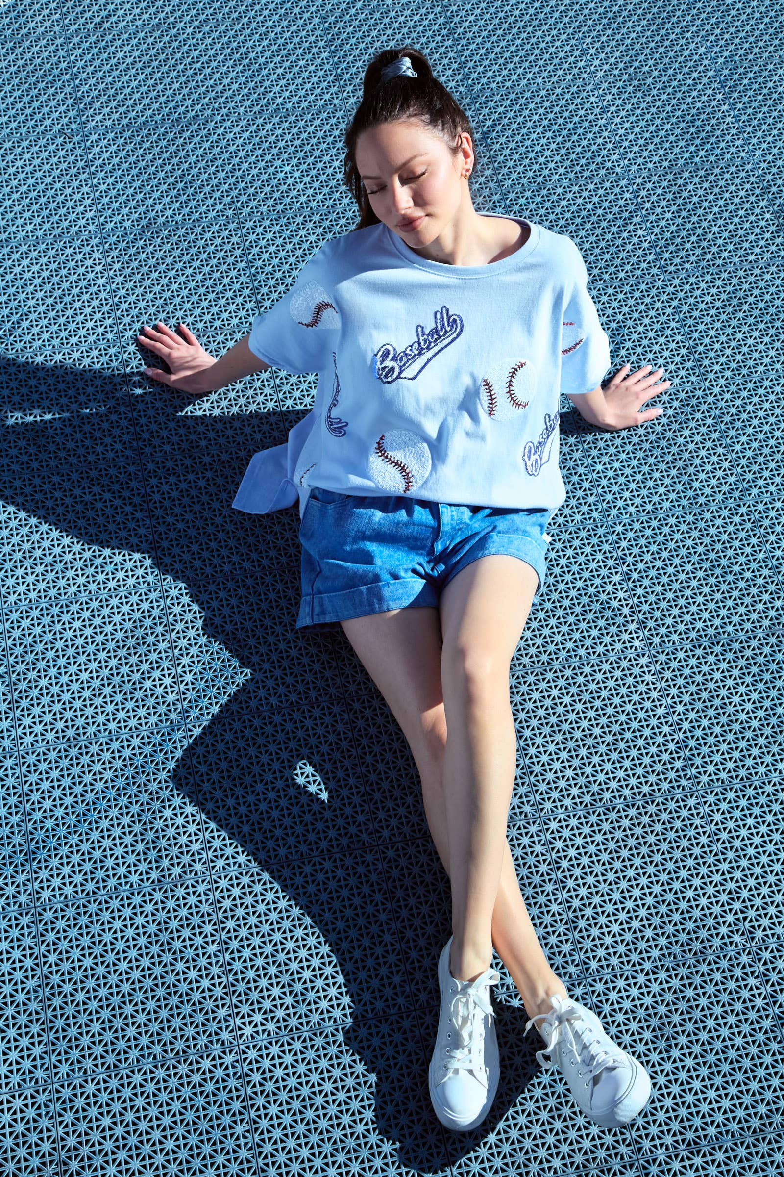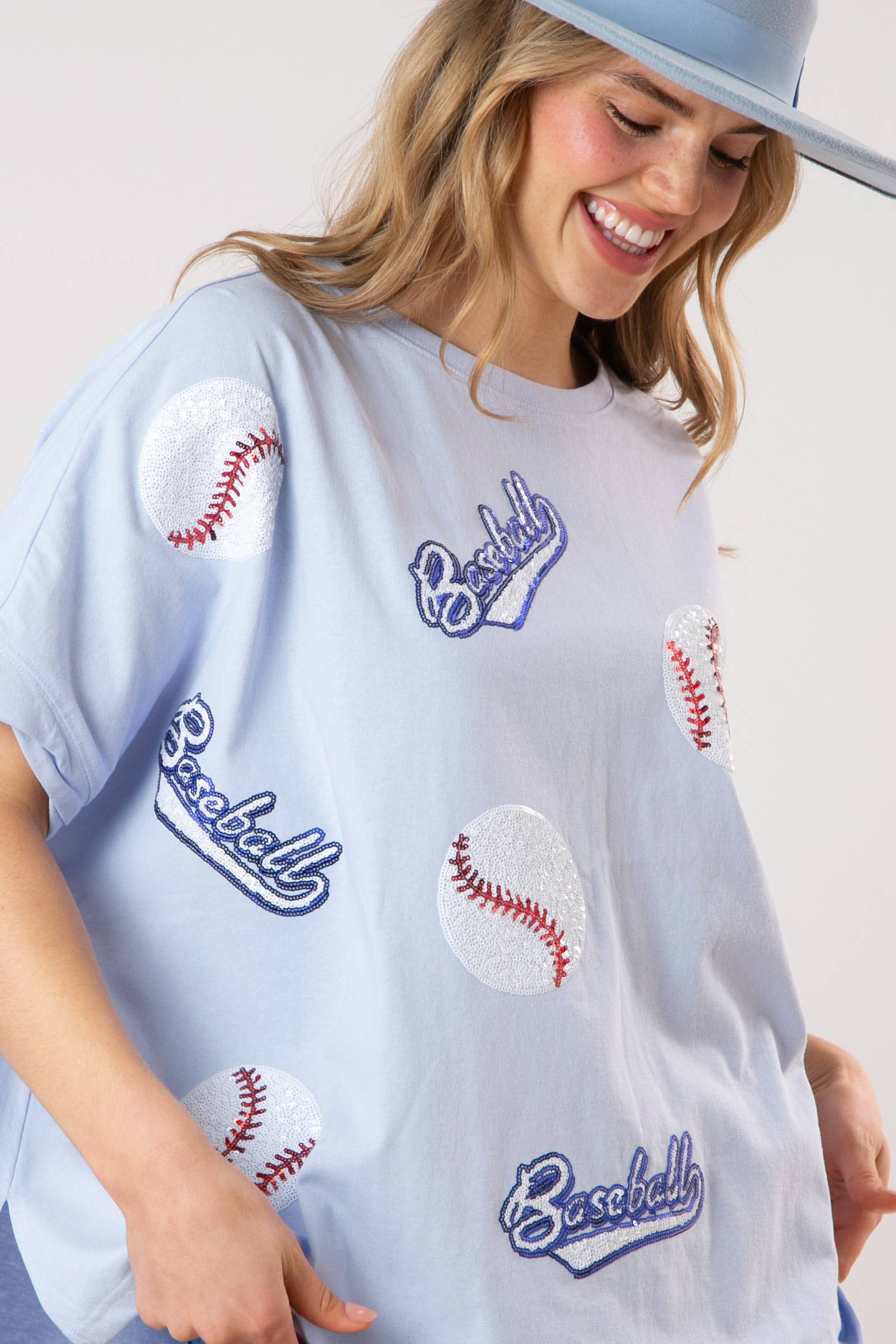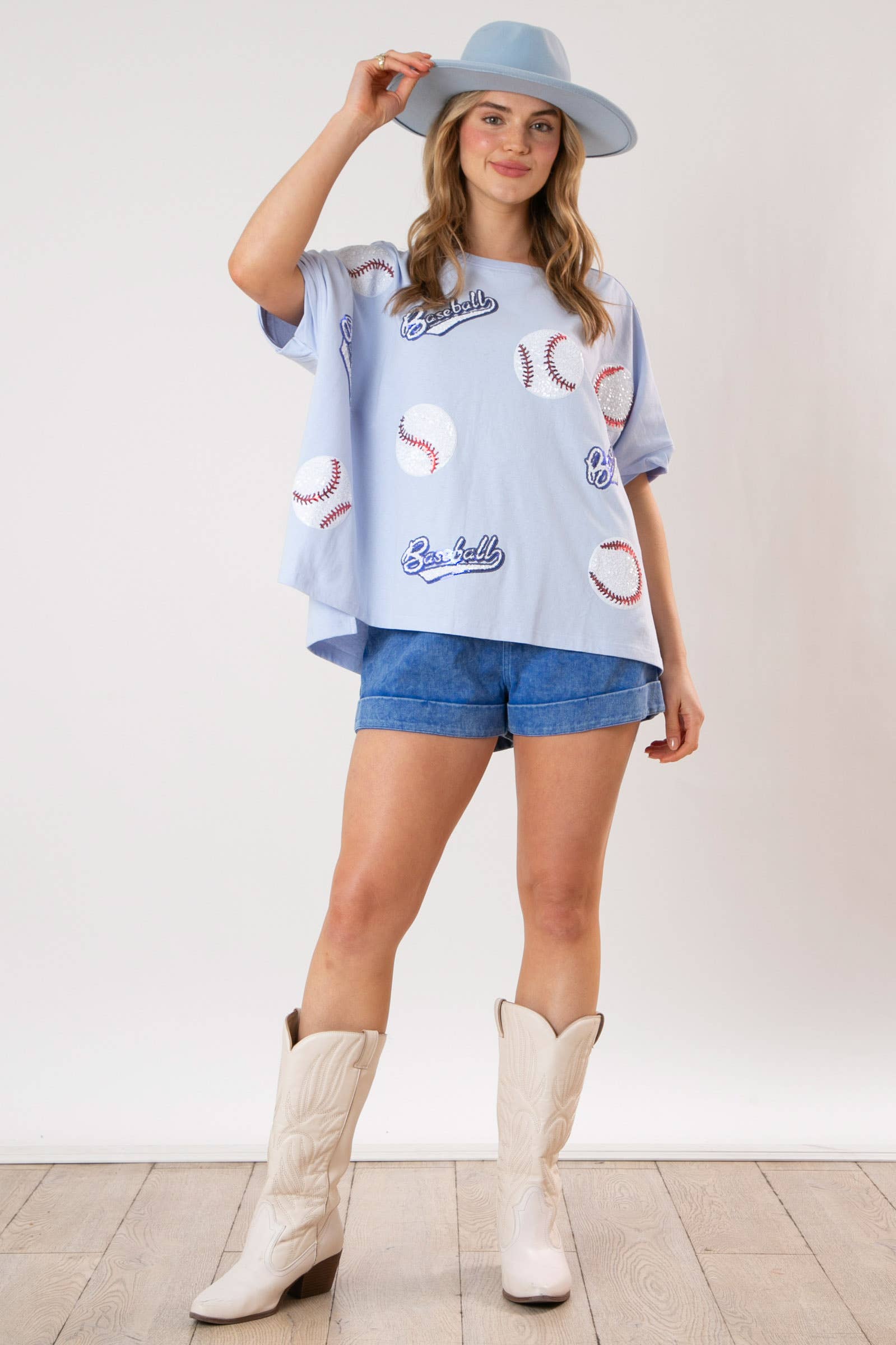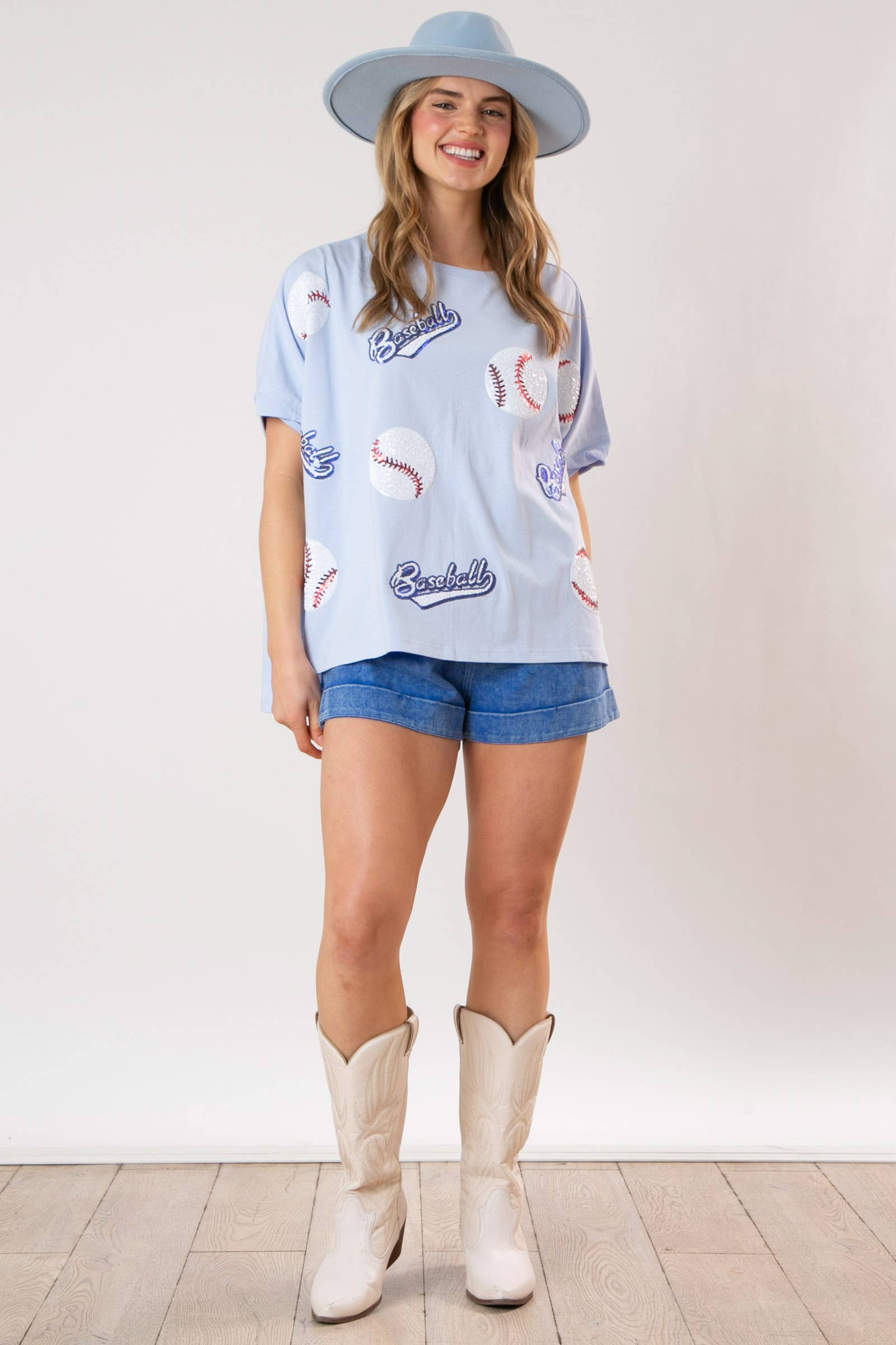 Baseball Sequins Short Sleeve Top - Short sleeves - Loose fit - Sequin baseball embellishments - Asymmetric high-low cut Red: 100% Cotton Made in China