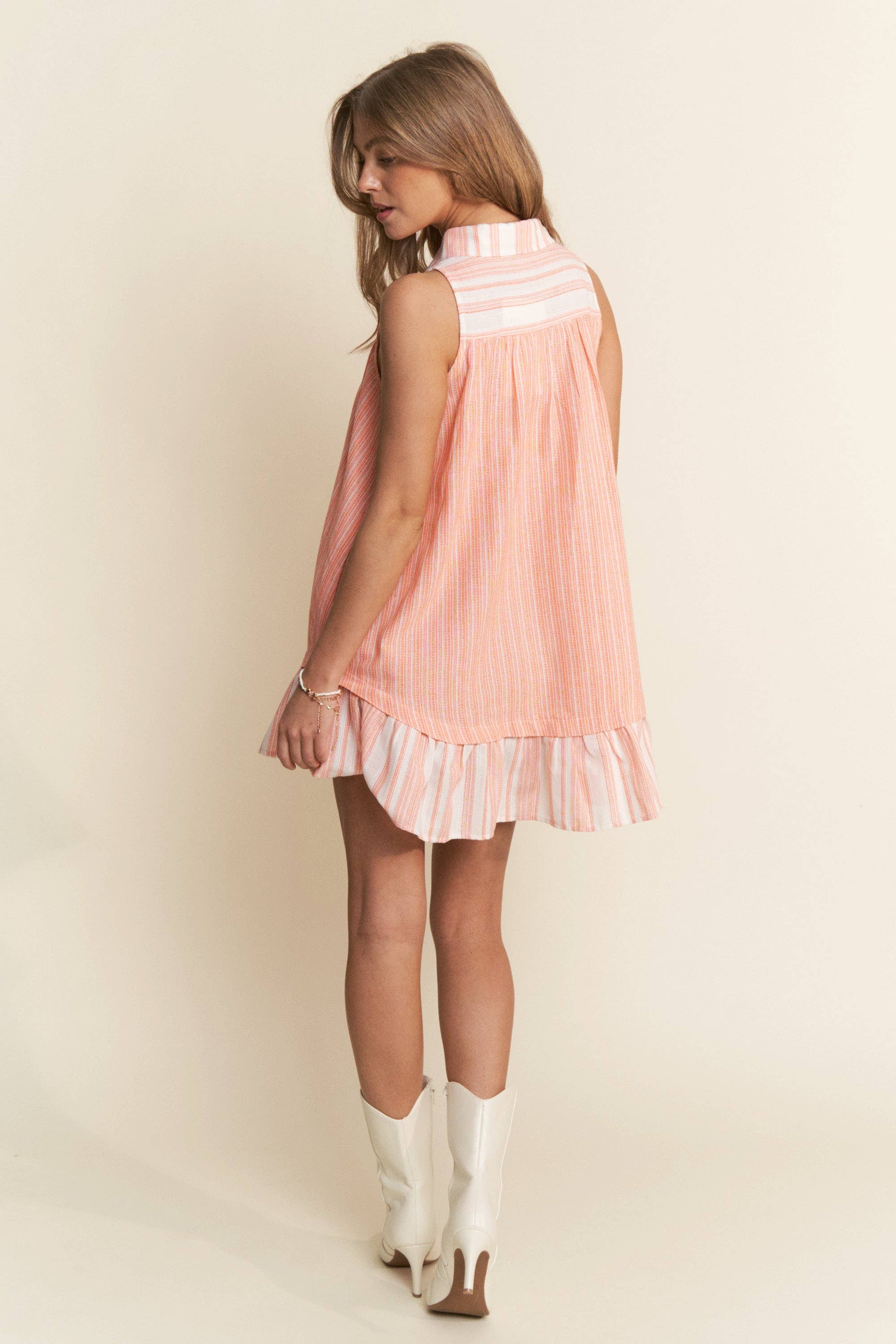 Women's button down A-line stripped multi pattern mini dress with pockets.