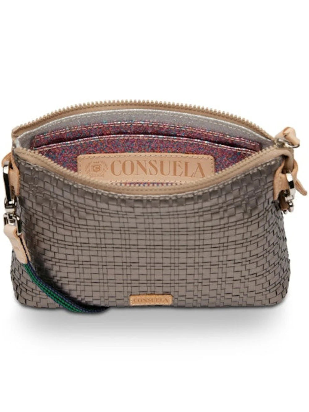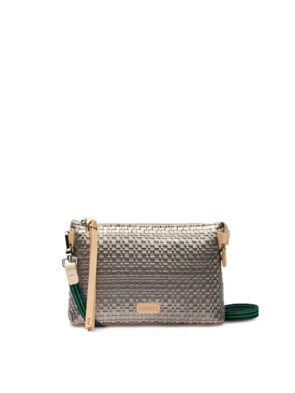 - Includes detachable and adjustable woven crossbody strap