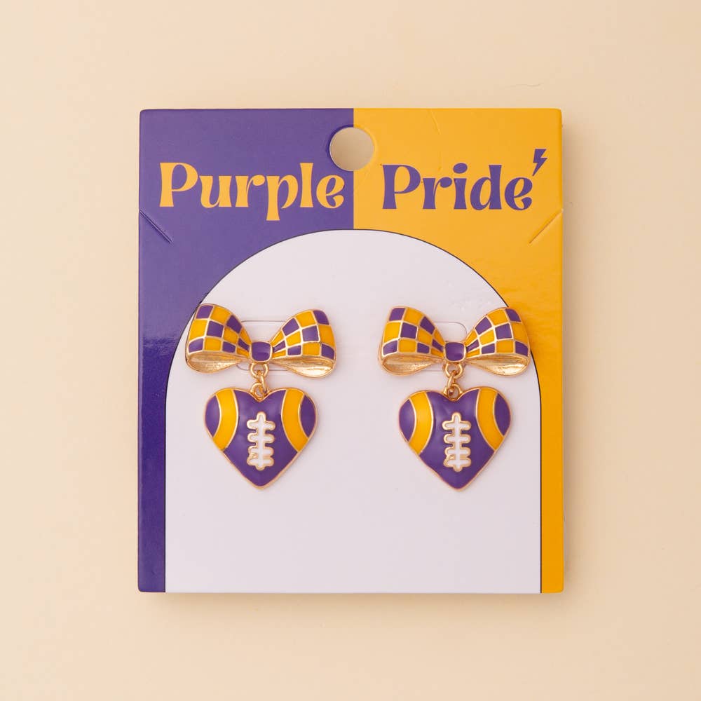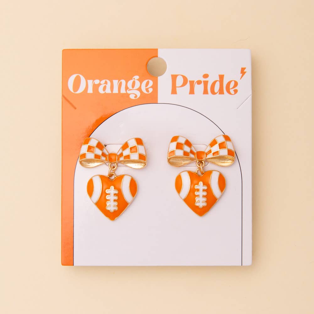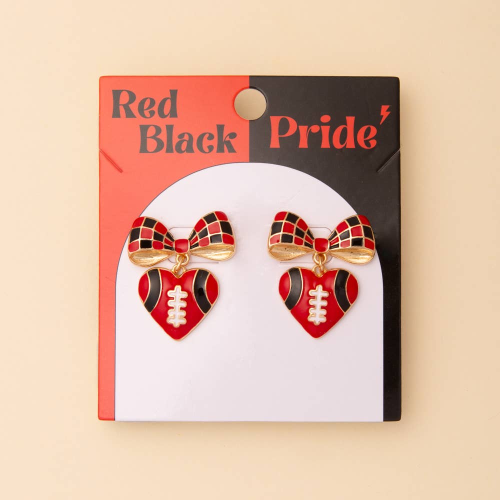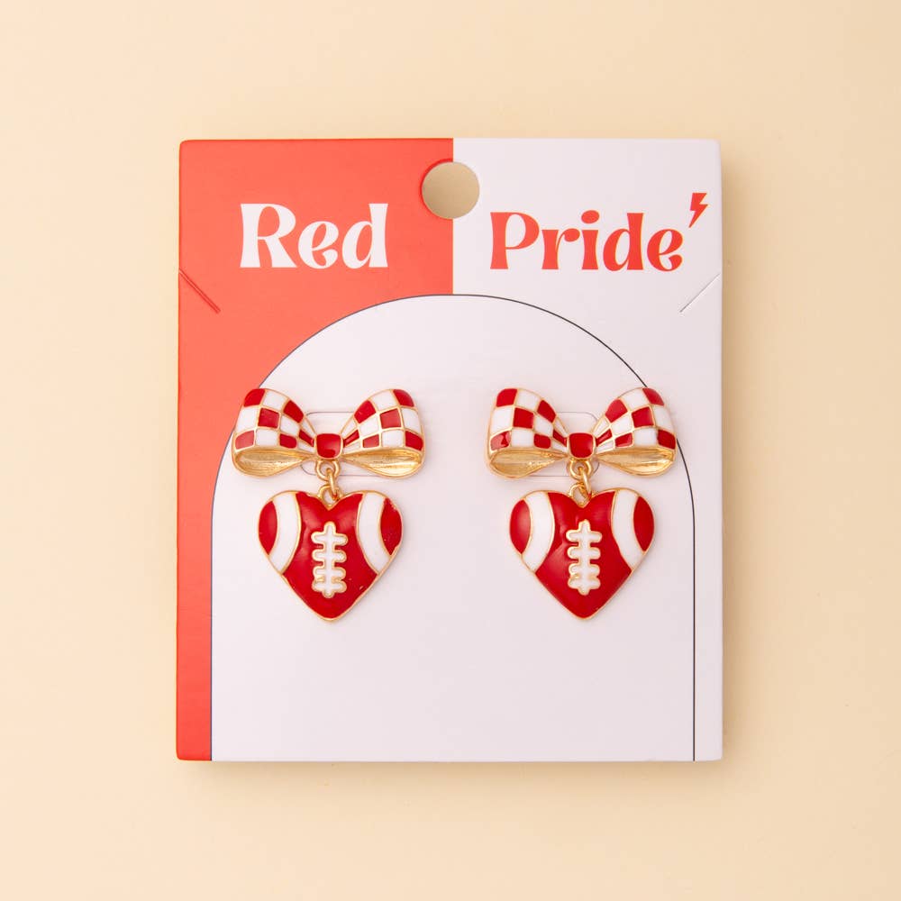 Bring the fun to game day with these cheeky enamel post dangle earrings, featuring a heart and heart-shaped football duo topped with a playful checkered bow. Finished in bold team colorways with a high-gloss enamel surface, these earrings offer lightweight comfort, secure post backing, and all-day wearability—perfect for high-energy school events and sporty celebrations.