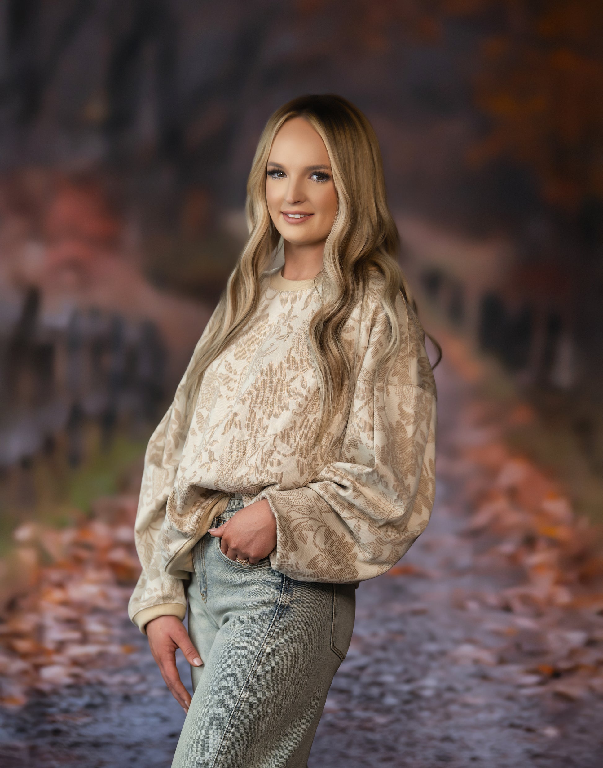 Women's knit floral print drop shoulder oversized sweater top. Pleated design on the sleeves. Ribbed cuff , bottom hem and neckline. Pockets.