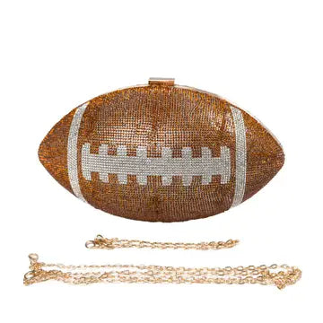 9 1/2" L x 5" H x 5 1/2" D, 16 1/2" Circumference * Hinge Opening, push-lock closure * Covered in Small Gems ( Gold Rhinestones) * Gold tone Hardware * Polyester Lining * Removable Gold Chain Shoulder Strap, 22 1/2" Drop