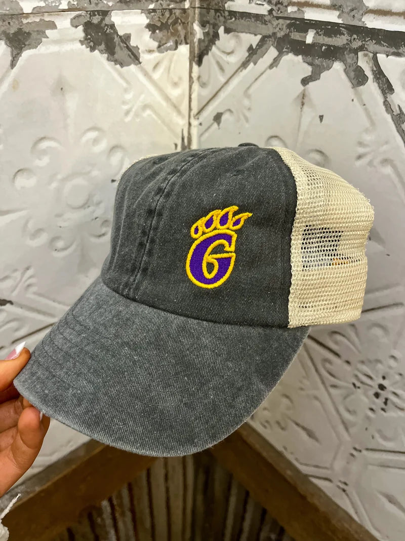 Black\ Cream trucker mesh back baseball cap with embroidered g-claw.