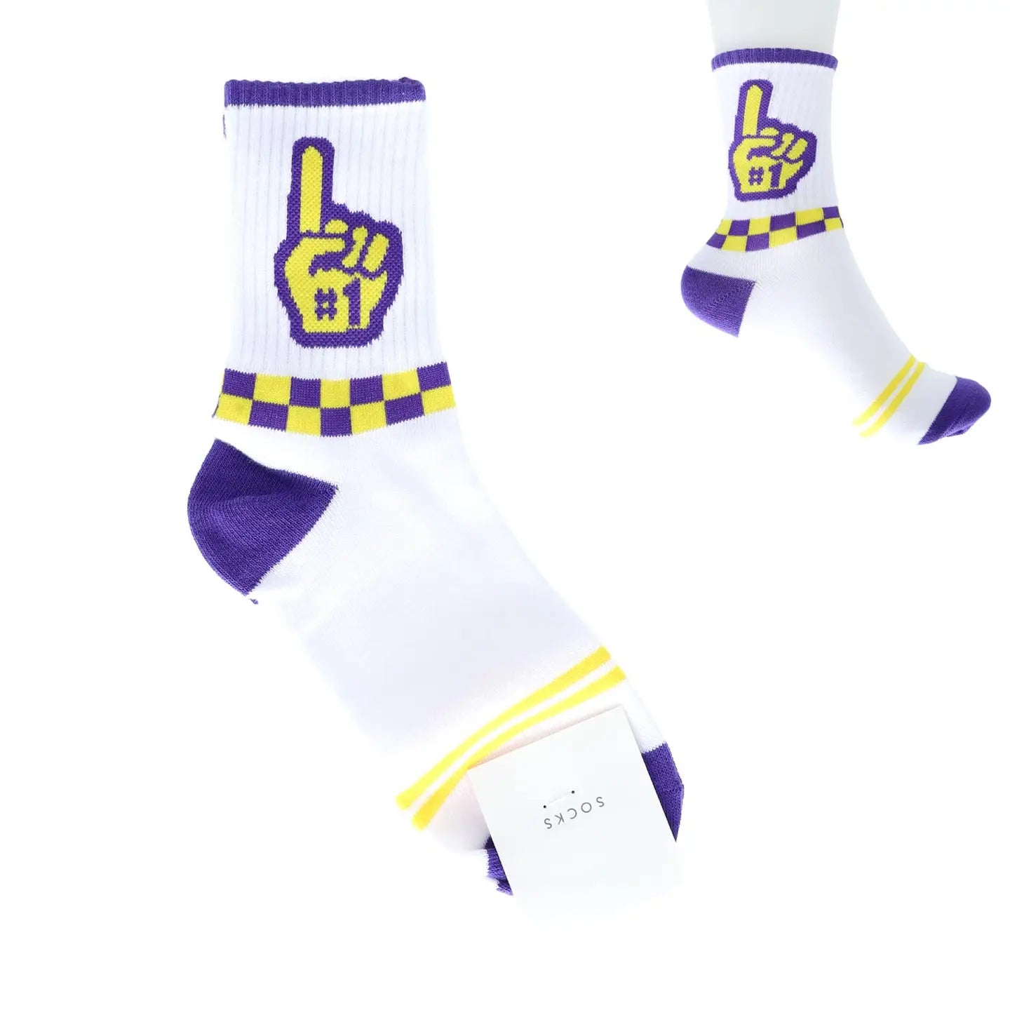 Step up your sock game with our Foam Hand Graphic Cotton Knit Women's Crew Socks. These socks feature a fun and eye-catching foam hand graphic design. The foam hand is adorned with a bold number one, representing your status as a true fan. Below the foam hand, you'll find a stylish checkered stripe pattern that adds a touch of flair to the socks. Made from soft and breathable