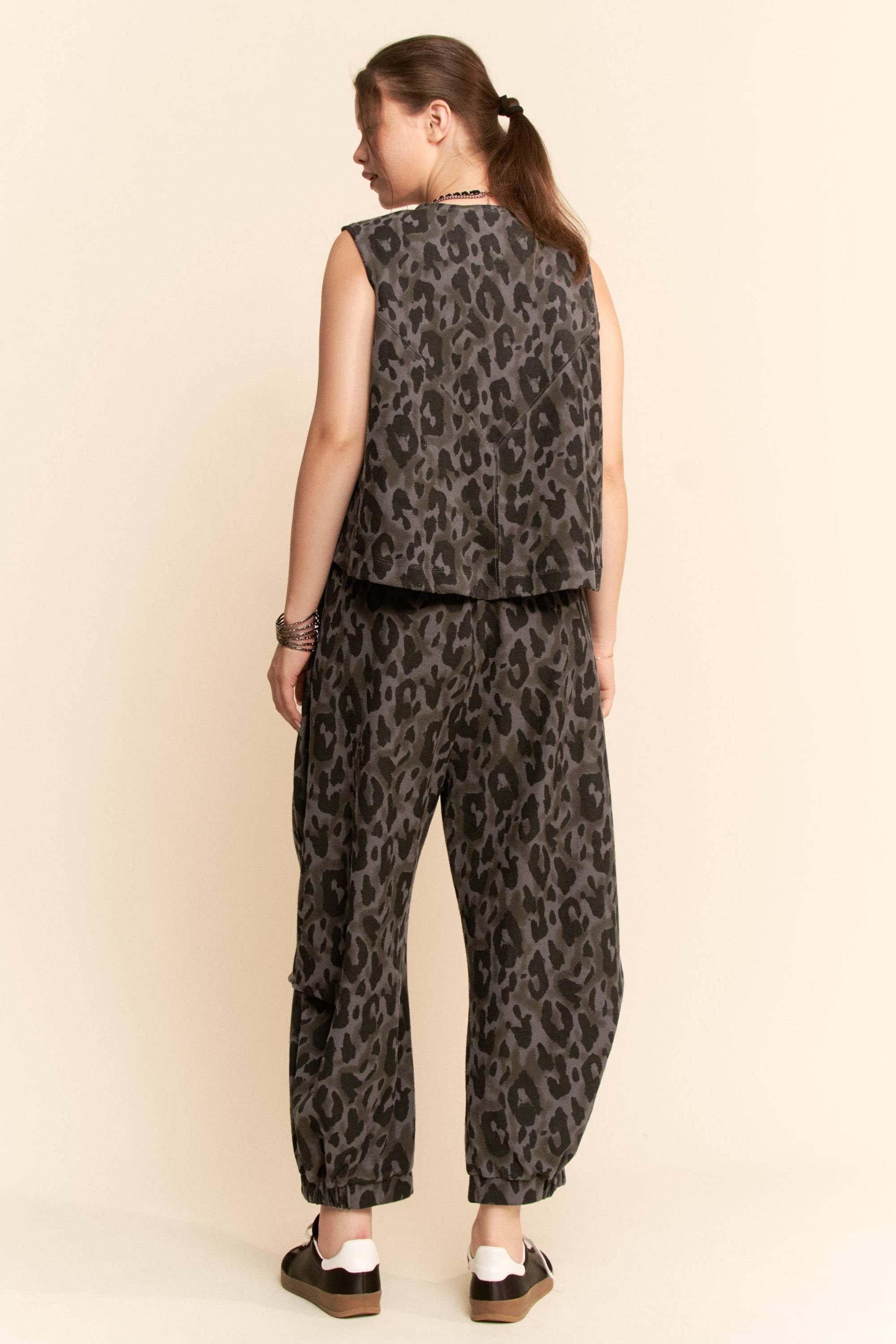 A bold, boutique-ready set featuring a relaxed sleeveless top with gathered hem and tapered lounge pants with cuffed ankles. The allover leopard print delivers elevated edge while the soft drape ensures everyday comfort. Effortlessly chic as a full set or styled separately for versatile wear.