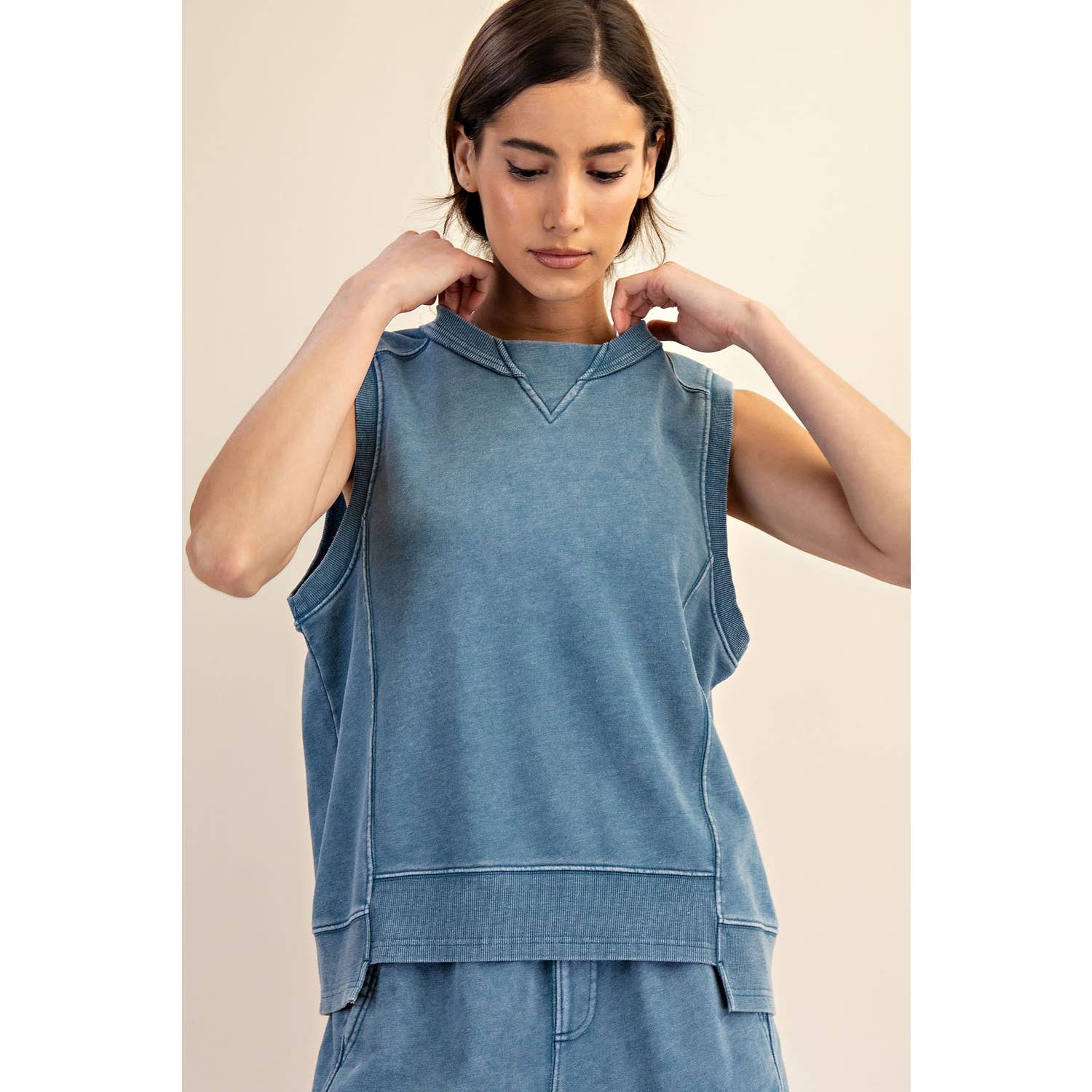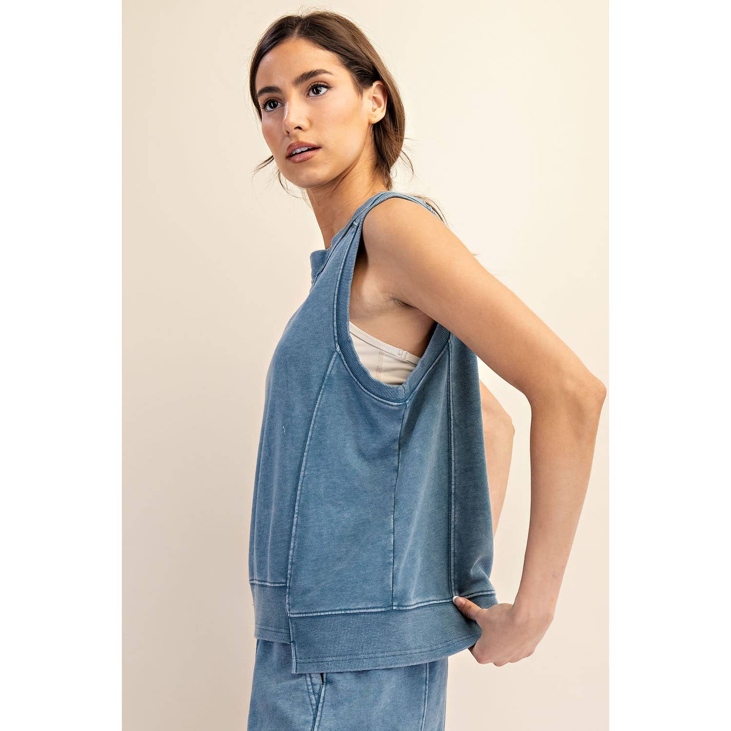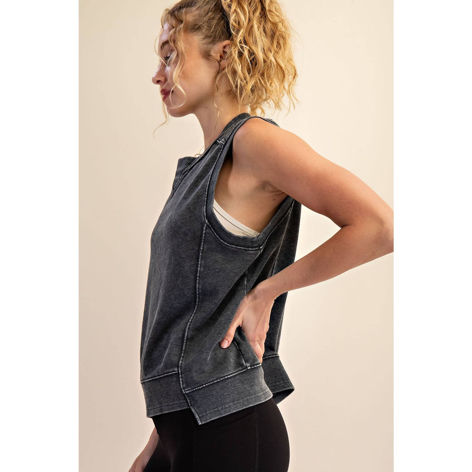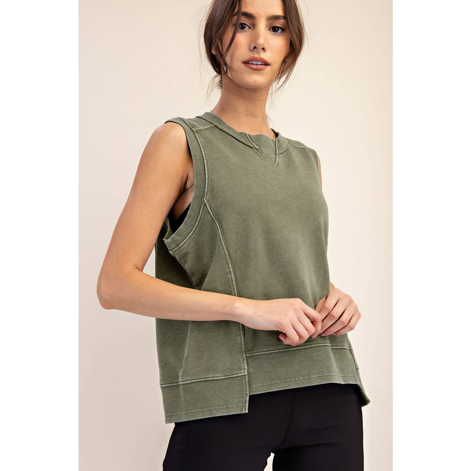 - Mineral-washed French terry sleeveless pullover featuring a relaxed fit, ribbed hem, and side slit accents for an effortless, lived-in look. Perfect for layering or wearing solo. Features: - Mineral washed French terry fabric - Relaxed fit - Crew neck - Sleeveless - Mid length - High low details - Ribbed collar and hem detail Model is 5'8" and wearing size Small. Fabric: 60% Cotton, 40% Polyester / Rib: 57% Cotton, 38% Polyester, 5% Spandex C.O.O: Import