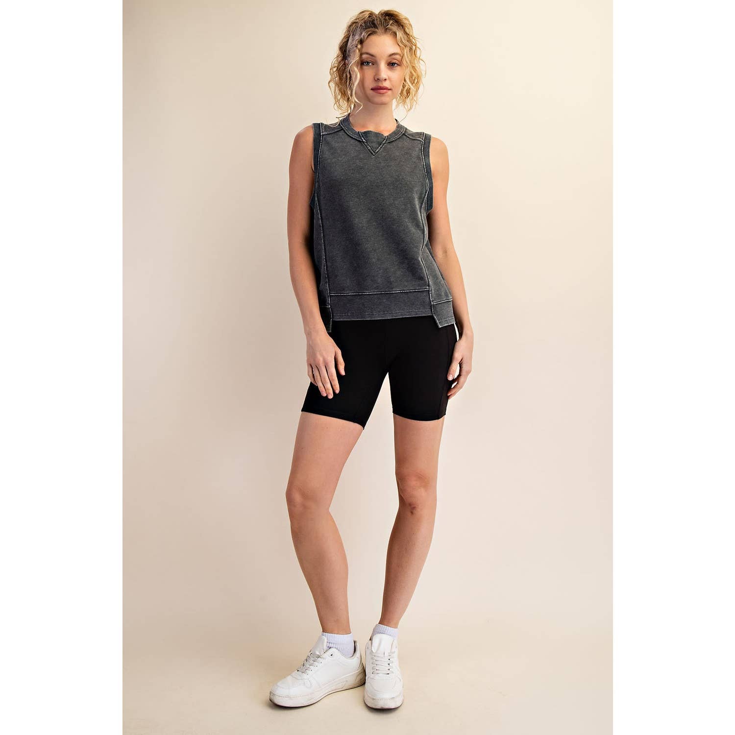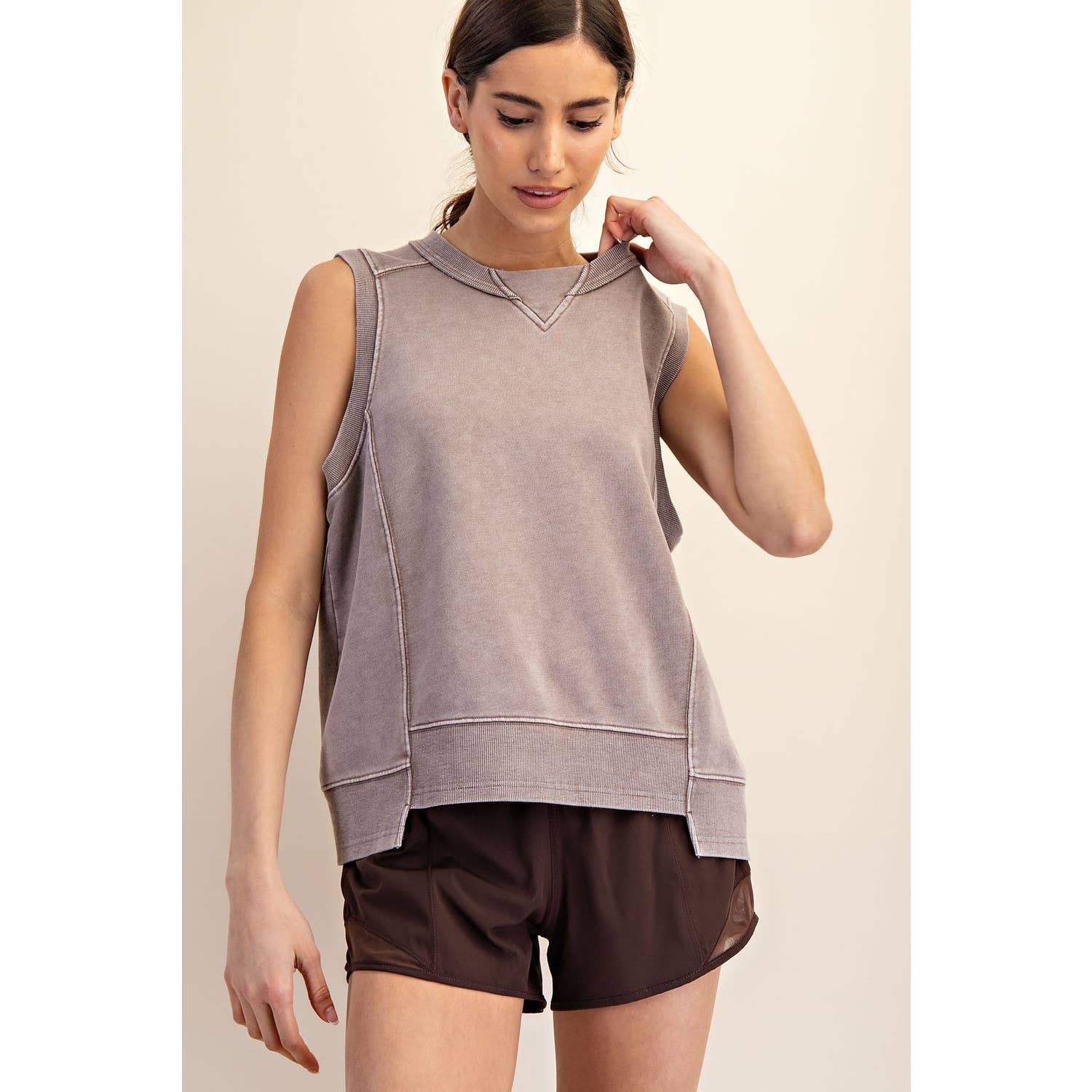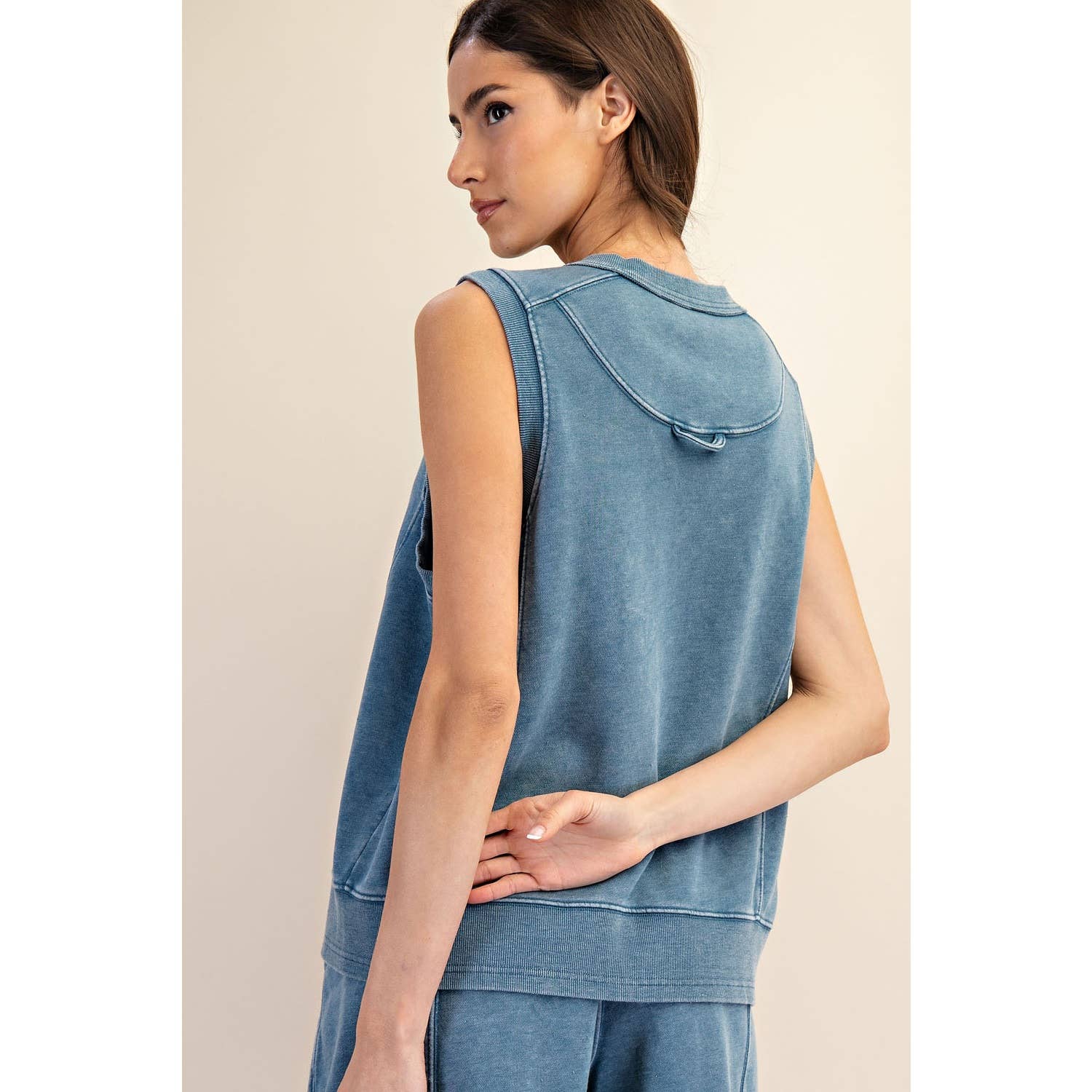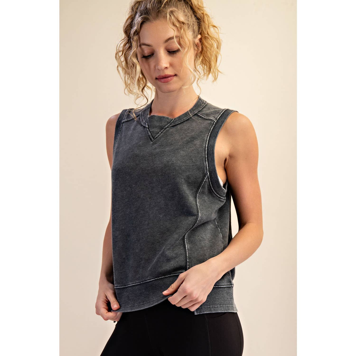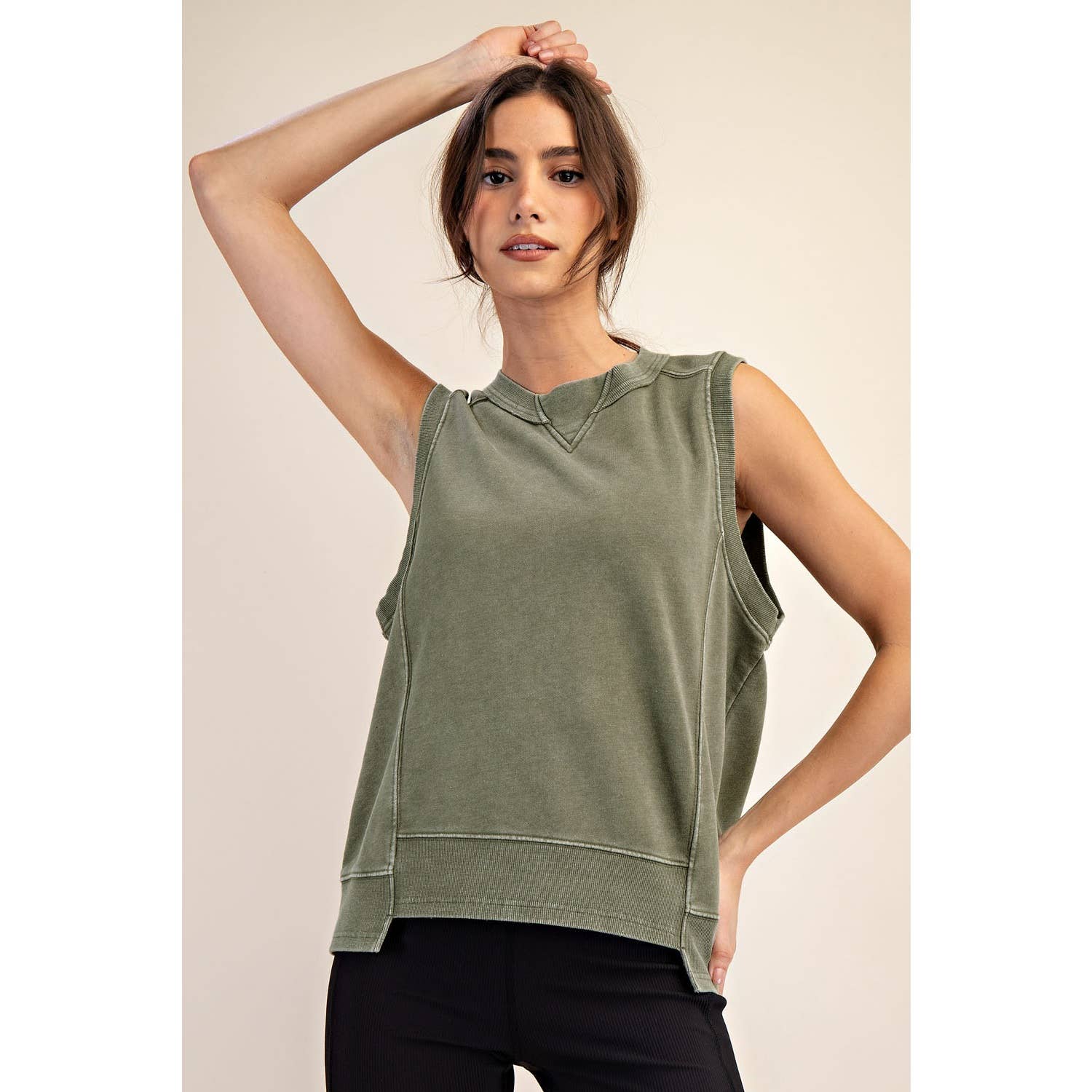 - Mineral-washed French terry sleeveless pullover featuring a relaxed fit, ribbed hem, and side slit accents for an effortless, lived-in look. Perfect for layering or wearing solo. Features: - Mineral washed French terry fabric - Relaxed fit - Crew neck - Sleeveless - Mid length - High low details - Ribbed collar and hem detail Model is 5'8" and wearing size Small. Fabric: 60% Cotton, 40% Polyester / Rib: 57% Cotton, 38% Polyester, 5% Spandex C.O.O: Import