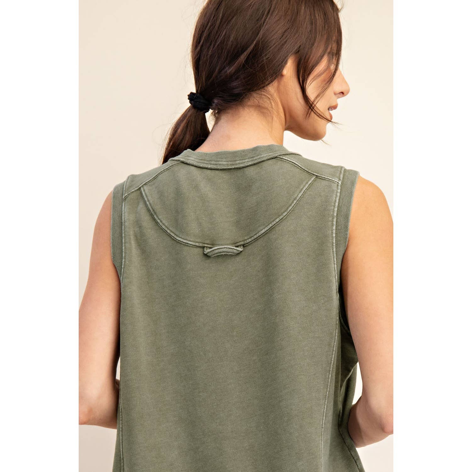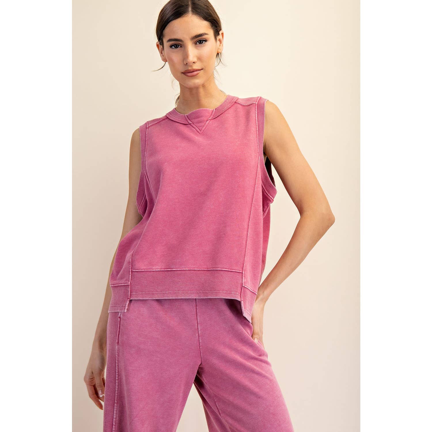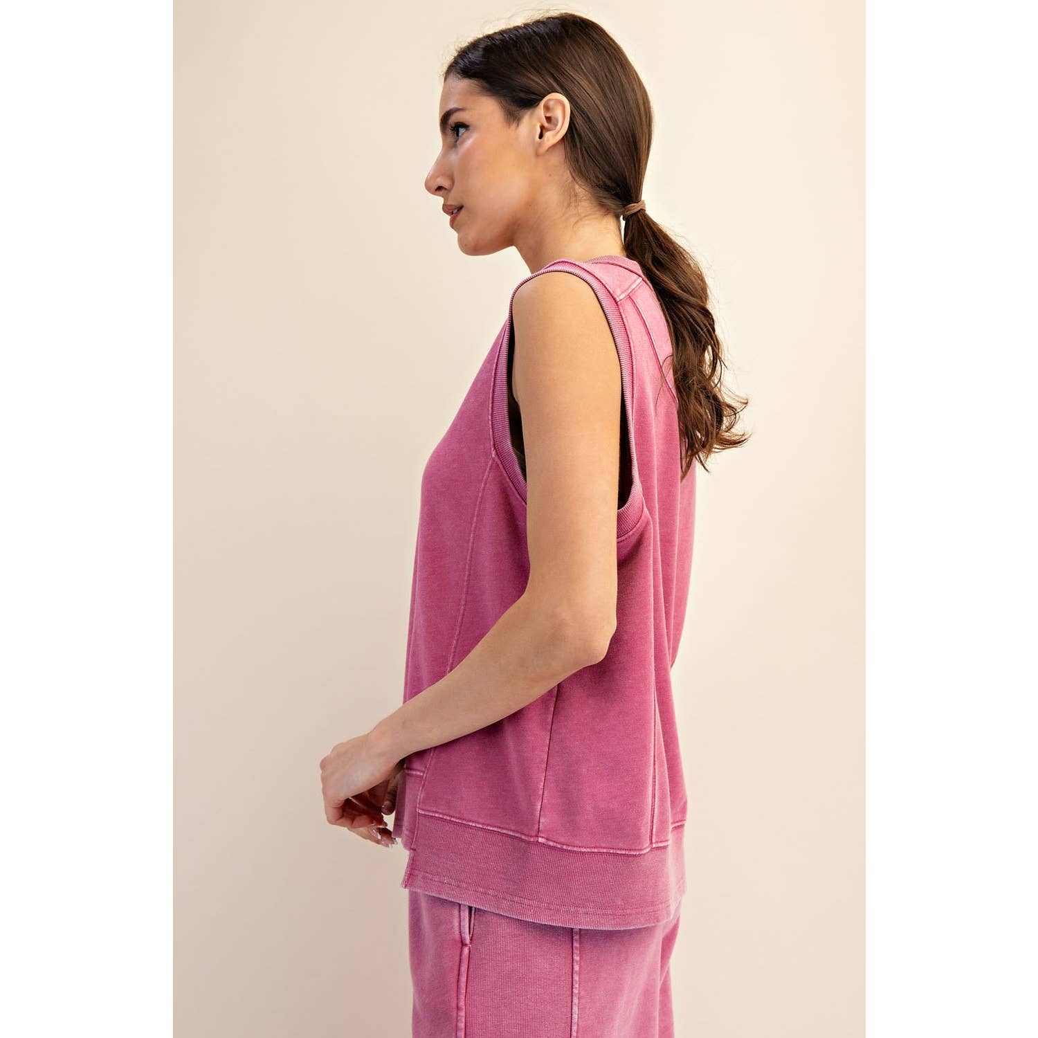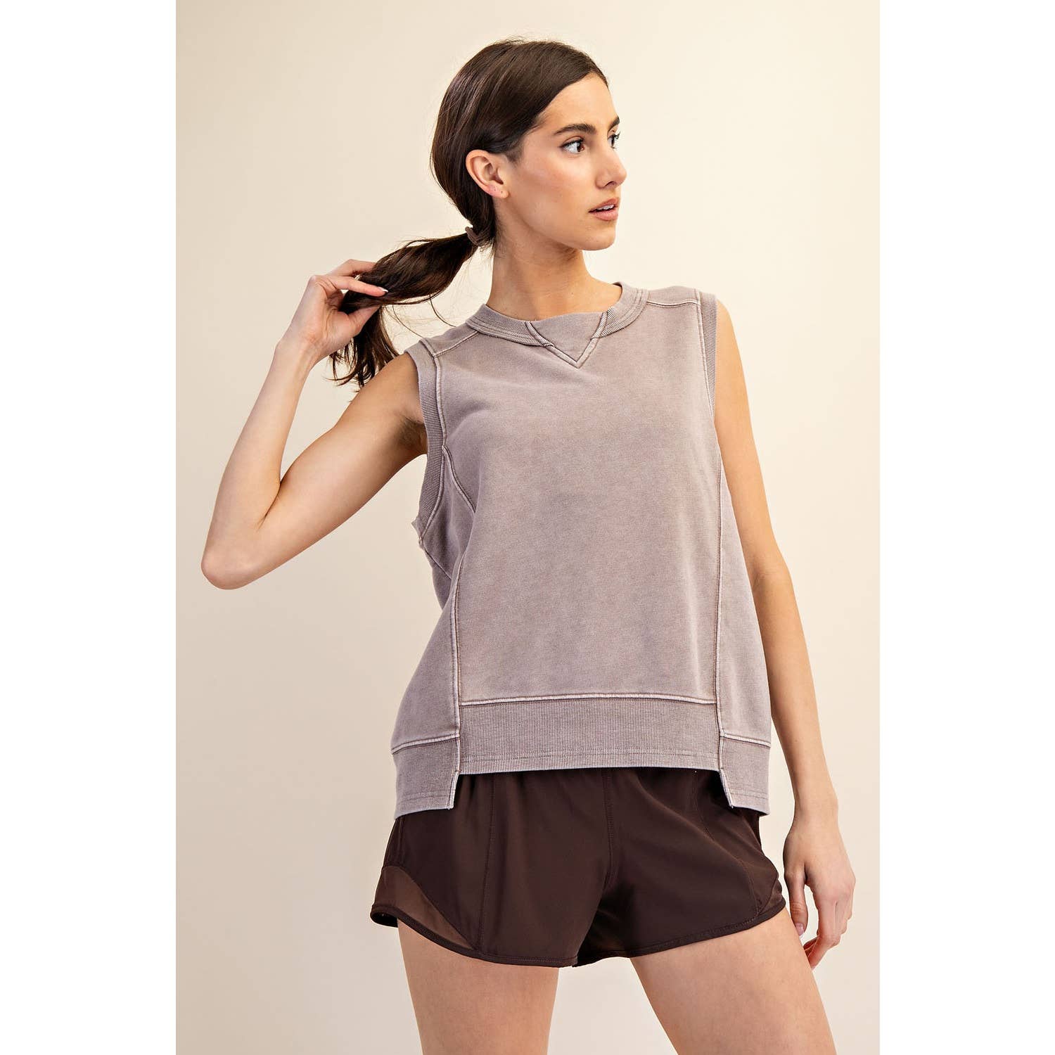 - Mineral-washed French terry sleeveless pullover featuring a relaxed fit, ribbed hem, and side slit accents for an effortless, lived-in look. Perfect for layering or wearing solo. Features: - Mineral washed French terry fabric - Relaxed fit - Crew neck - Sleeveless - Mid length - High low details - Ribbed collar and hem detail Model is 5'8" and wearing size Small. Fabric: 60% Cotton, 40% Polyester / Rib: 57% Cotton, 38% Polyester, 5% Spandex C.O.O: Import