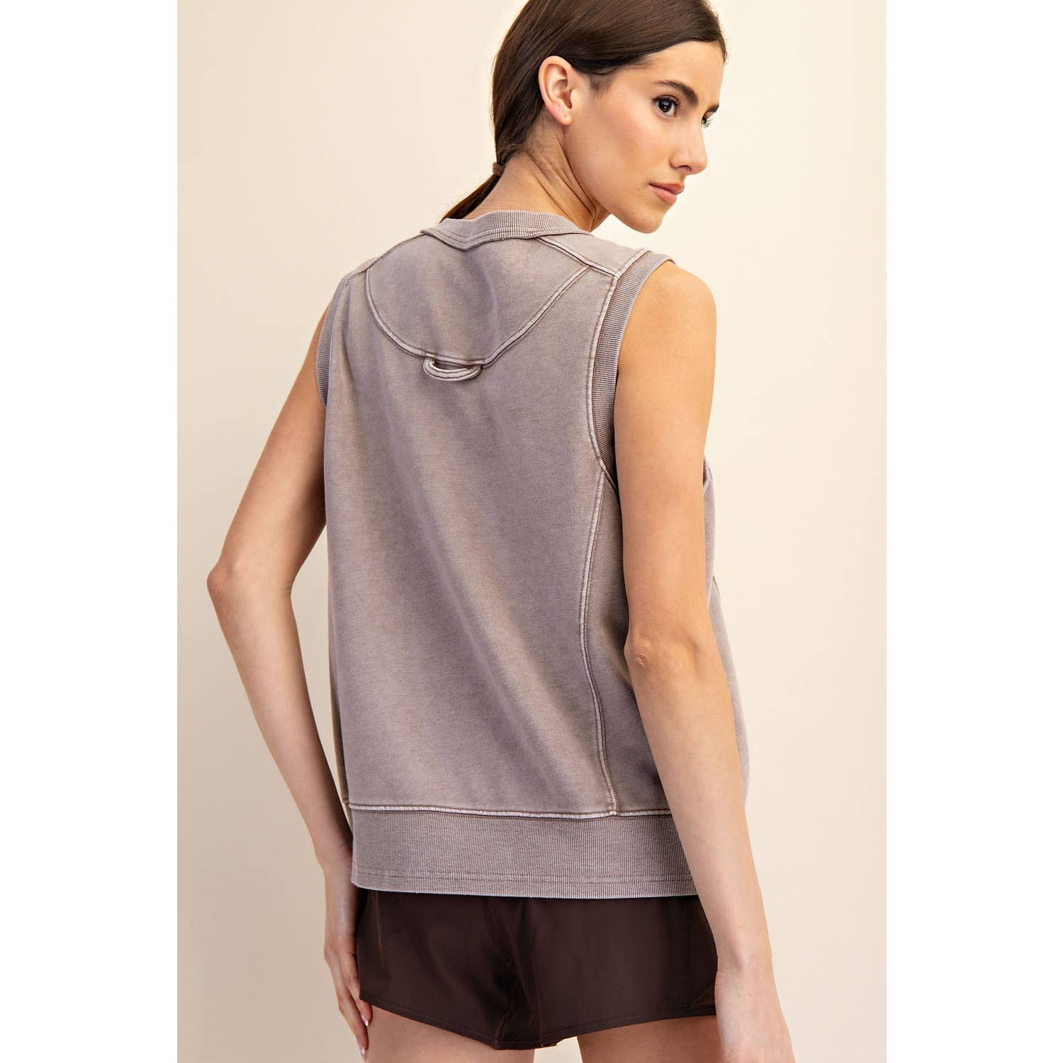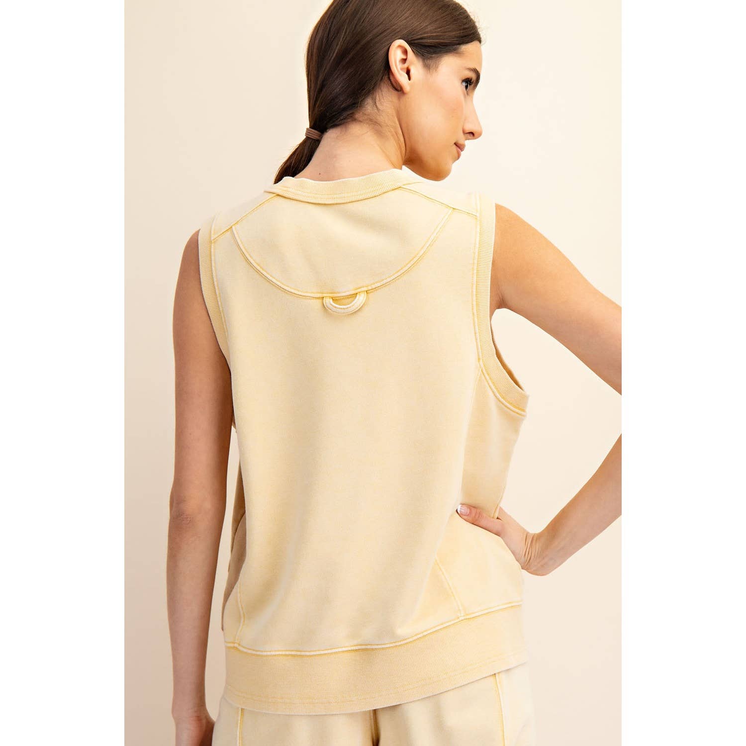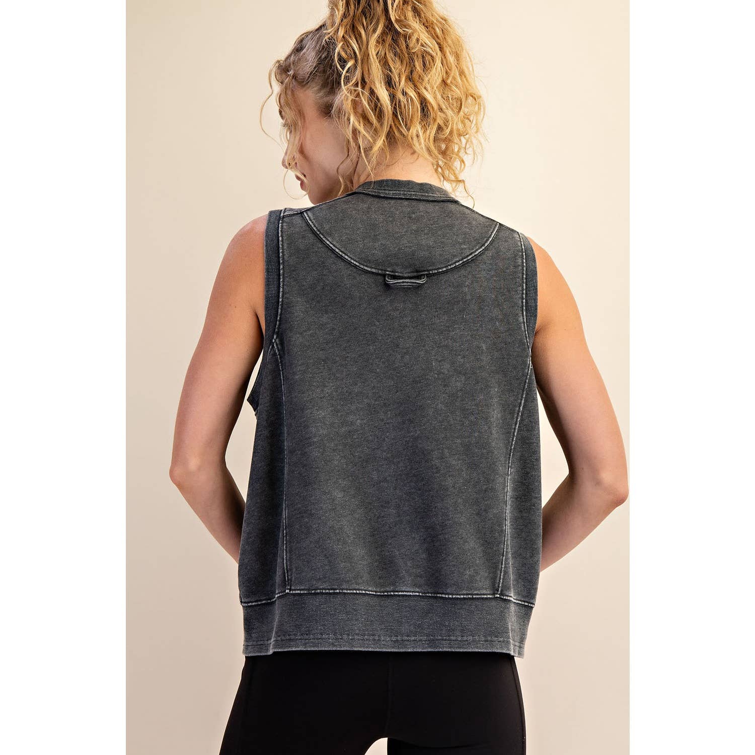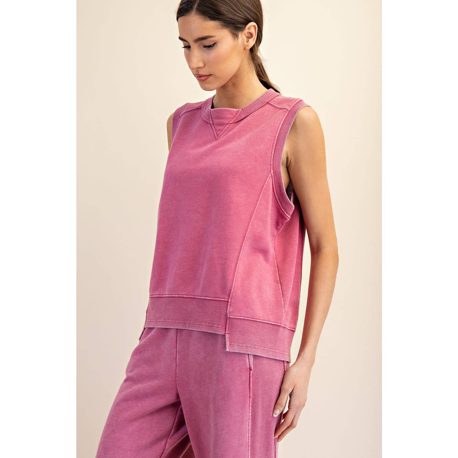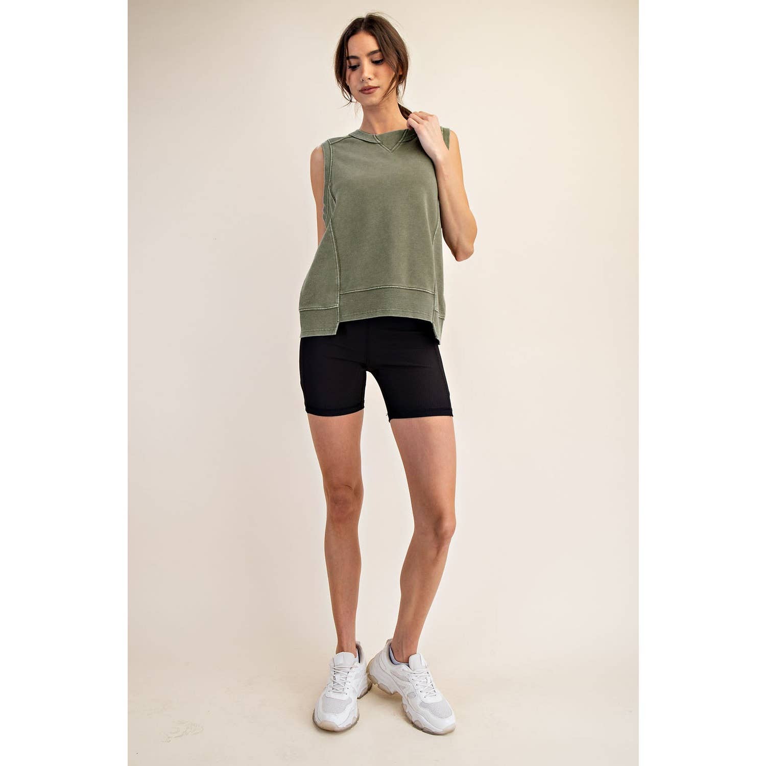 - Mineral-washed French terry sleeveless pullover featuring a relaxed fit, ribbed hem, and side slit accents for an effortless, lived-in look. Perfect for layering or wearing solo. Features: - Mineral washed French terry fabric - Relaxed fit - Crew neck - Sleeveless - Mid length - High low details - Ribbed collar and hem detail Model is 5'8" and wearing size Small. Fabric: 60% Cotton, 40% Polyester / Rib: 57% Cotton, 38% Polyester, 5% Spandex C.O.O: Import