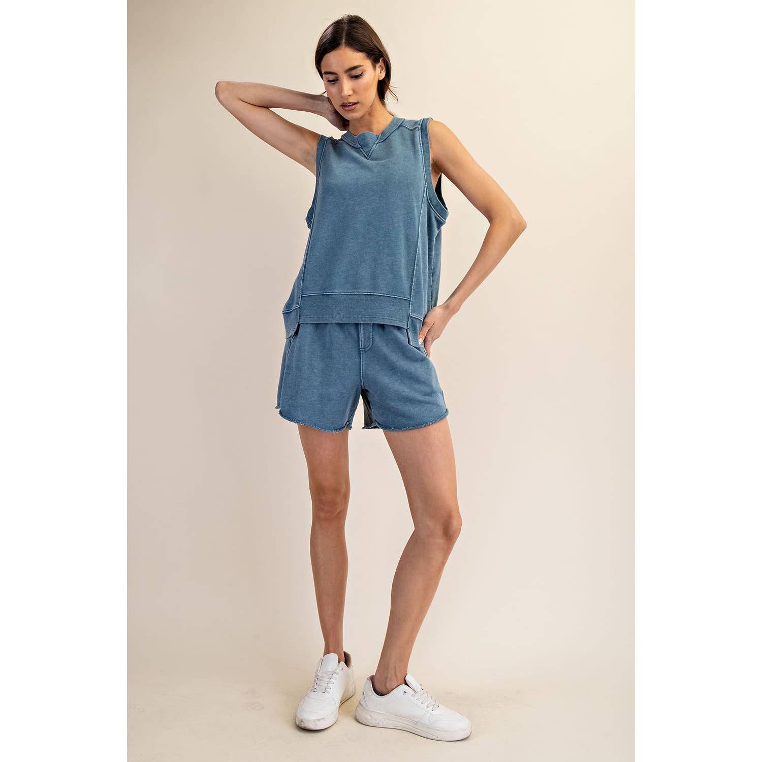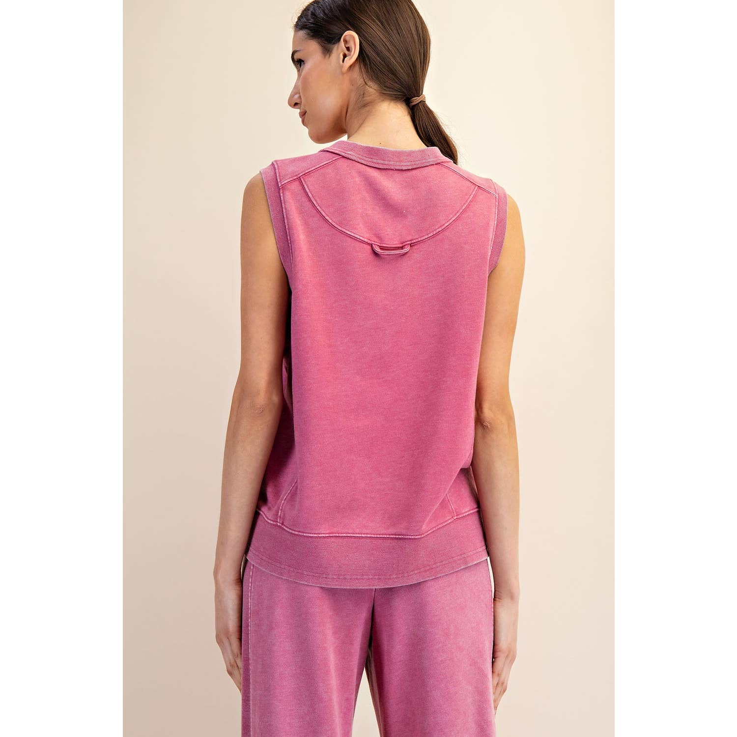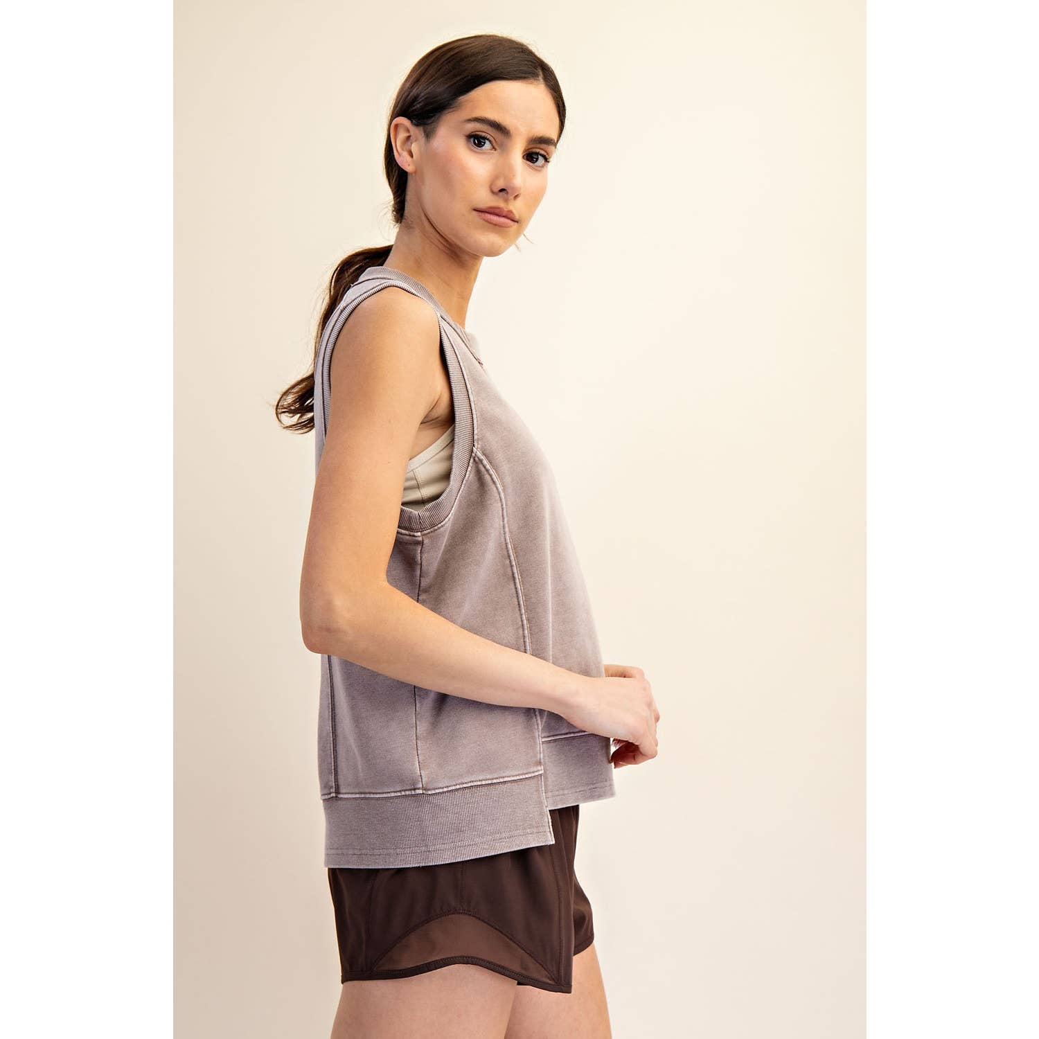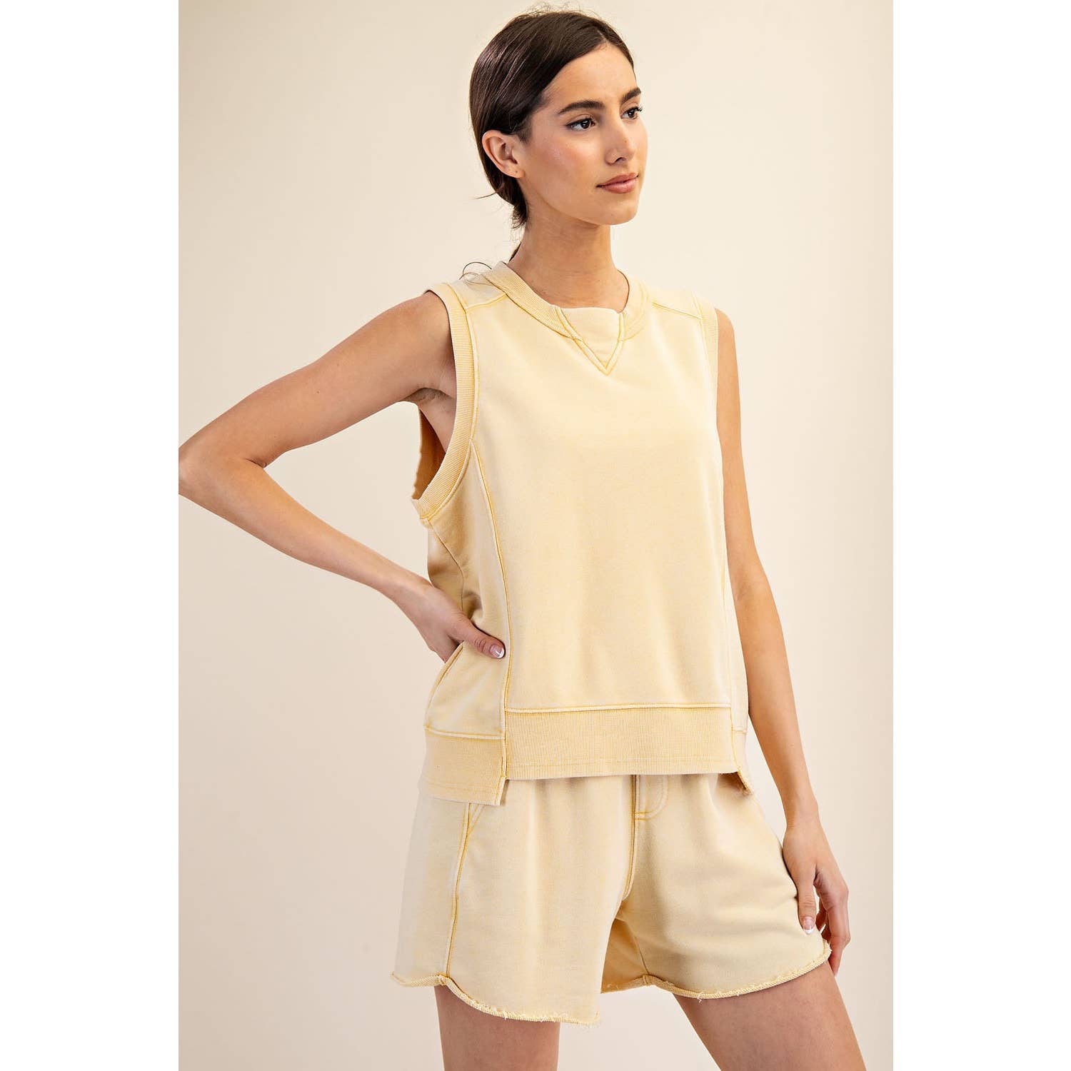 - Mineral-washed French terry sleeveless pullover featuring a relaxed fit, ribbed hem, and side slit accents for an effortless, lived-in look. Perfect for layering or wearing solo. Features: - Mineral washed French terry fabric - Relaxed fit - Crew neck - Sleeveless - Mid length - High low details - Ribbed collar and hem detail Model is 5'8" and wearing size Small. Fabric: 60% Cotton, 40% Polyester / Rib: 57% Cotton, 38% Polyester, 5% Spandex C.O.O: Import