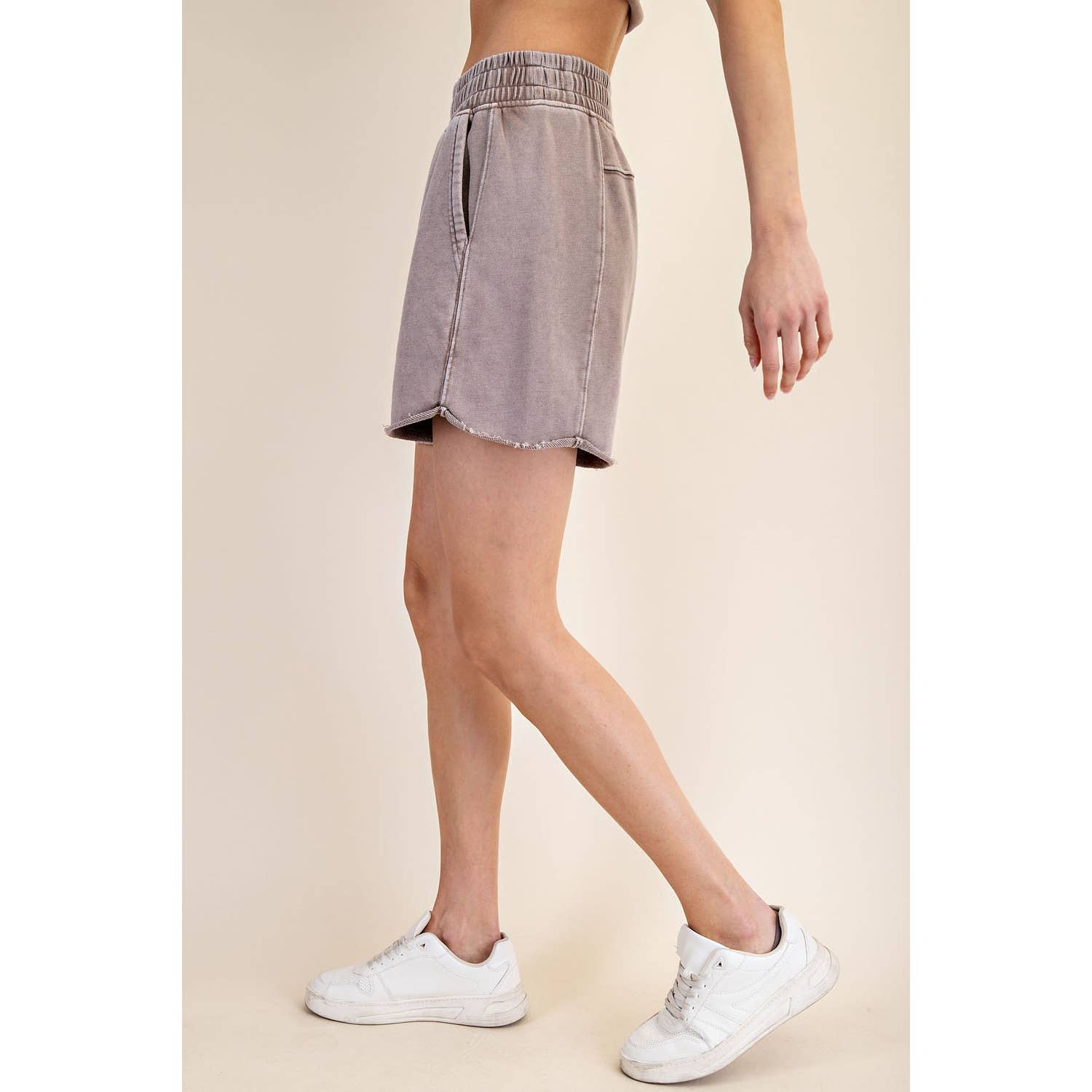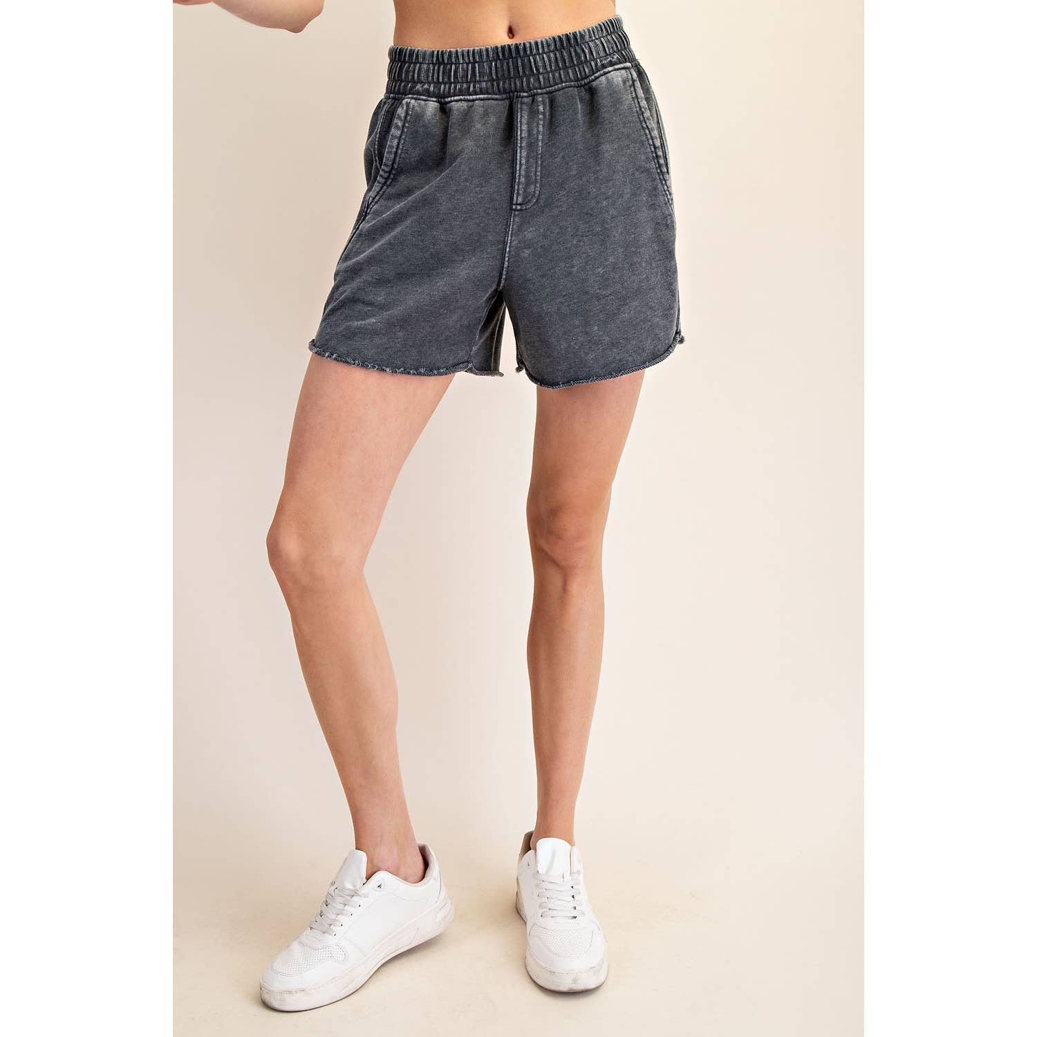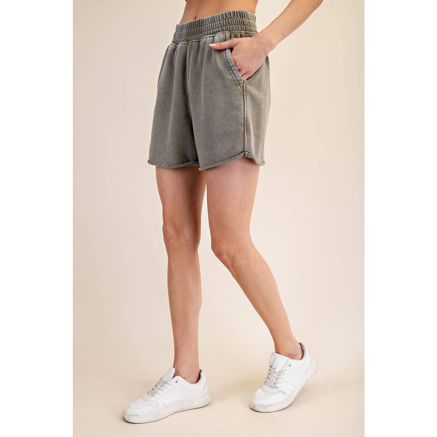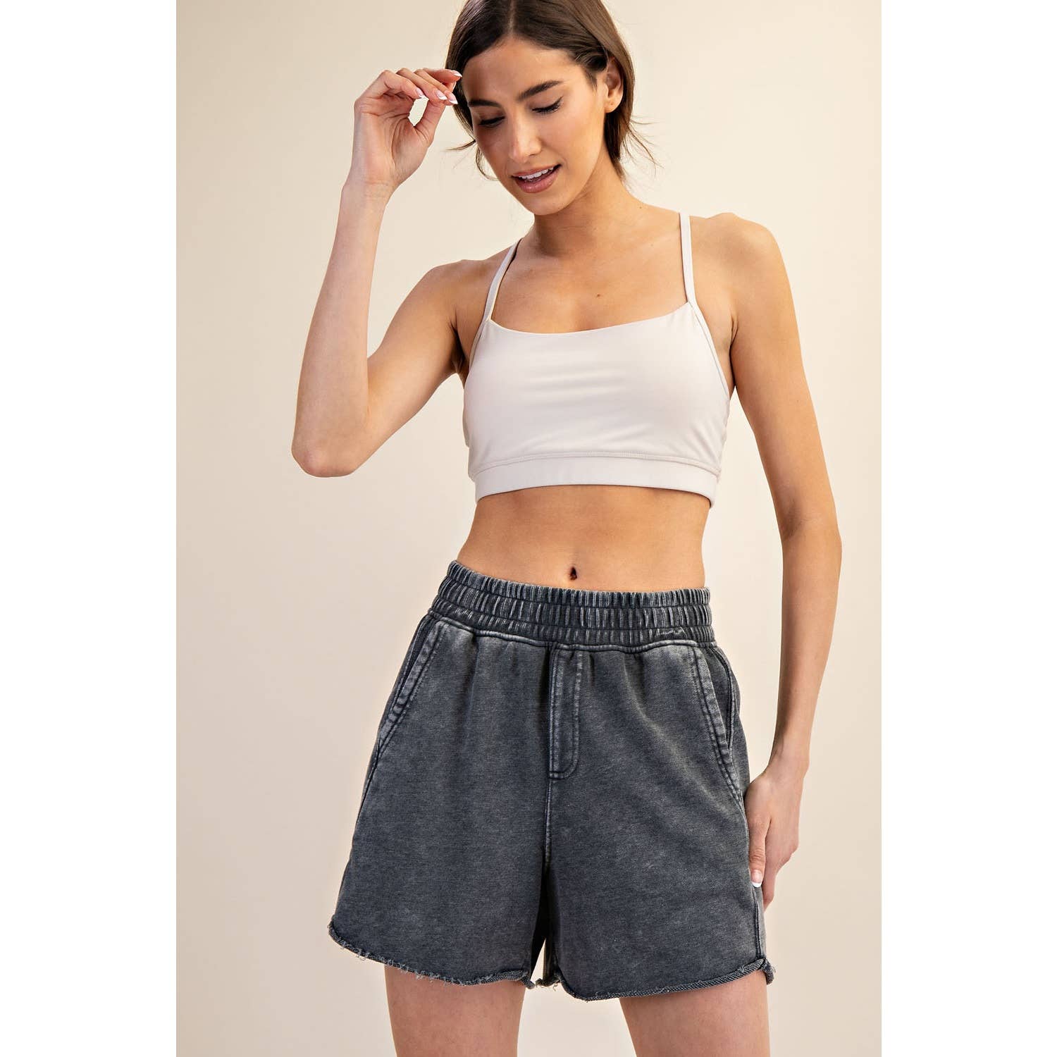 - Mineral-washed French terry shorts featuring a soft, lived-in feel, an elastic waistband, and side pockets for everyday comfort and style. Perfect for lounging or casual outings. Features: - Mineral washed French terry fabric - Relaxed fit - High rise / High waist - Mid-thigh length - Exposed seam details - Elastic waistband - Side pockets Model is 5'8" and wearing size Small. Fabric: 60% Cotton, 40% Polyester / Rib: 57% Cotton, 38% Polyester, 5% Spandex C.O.O: Import