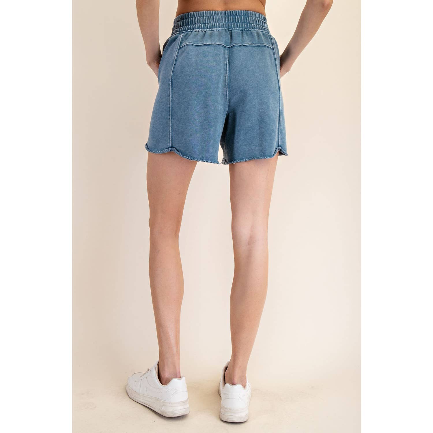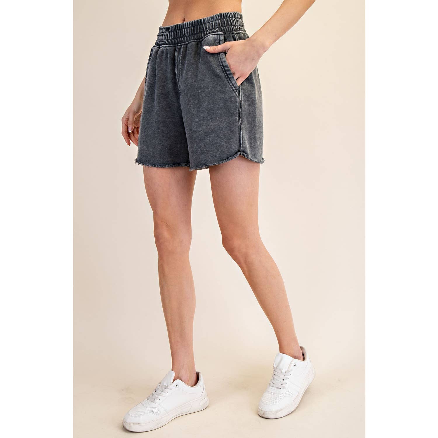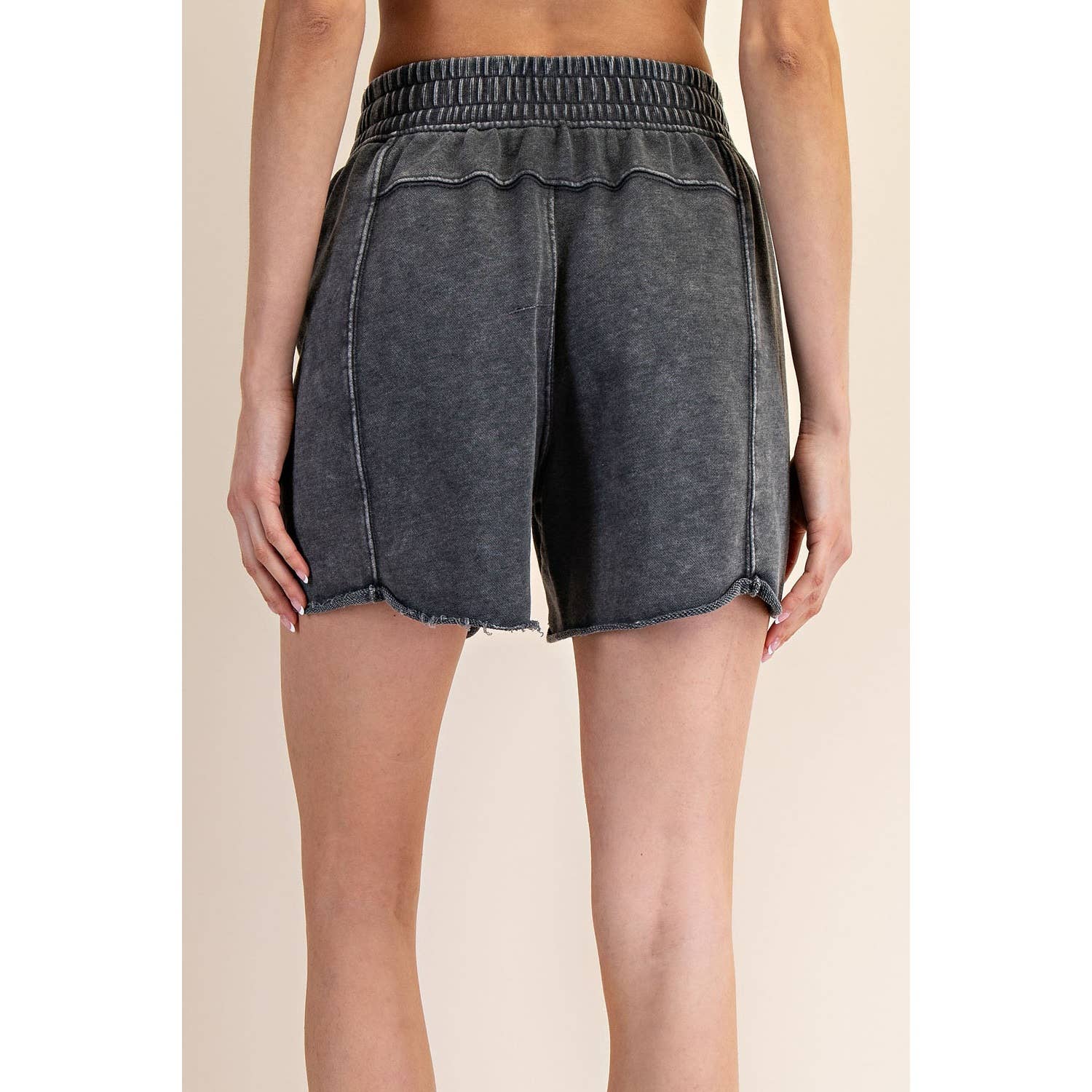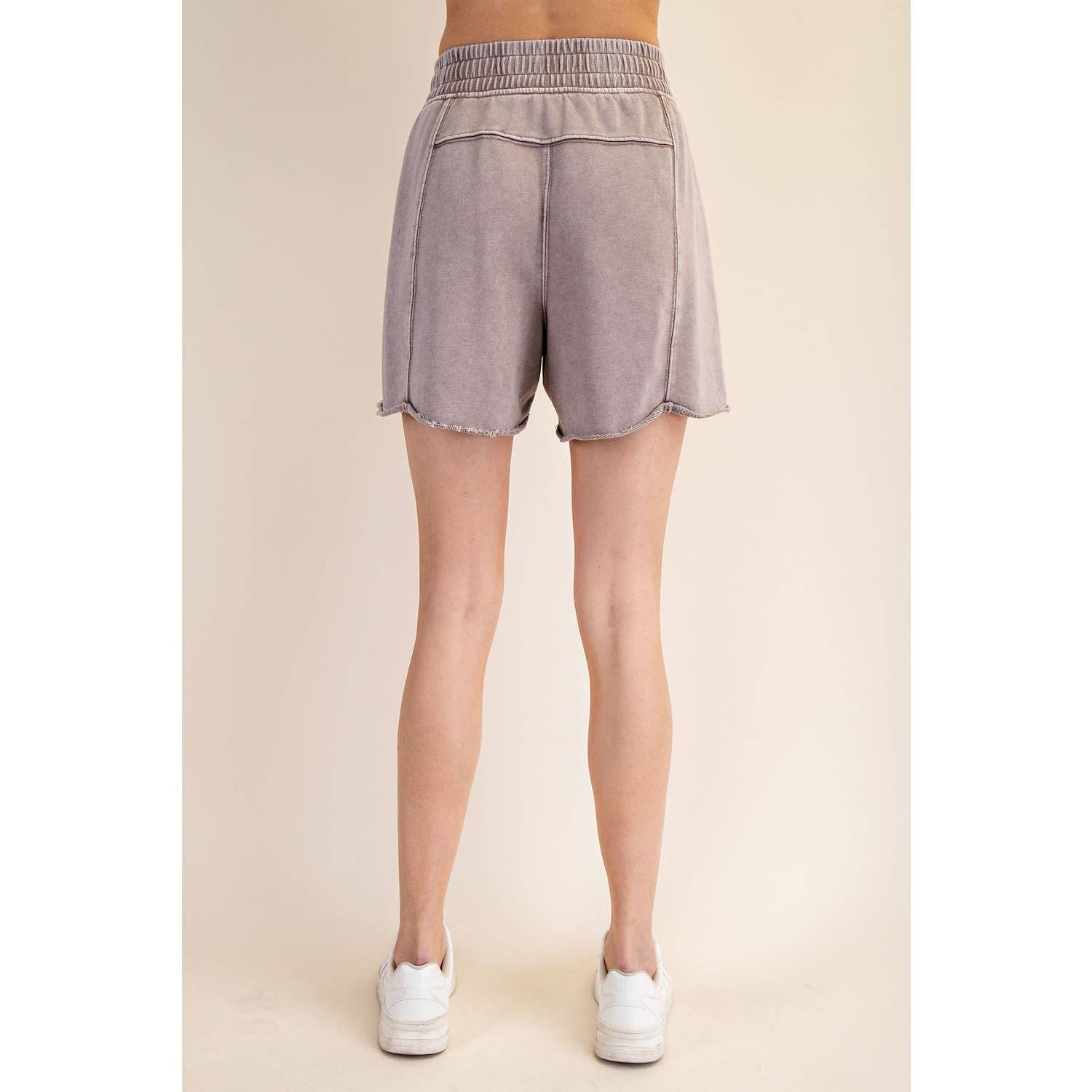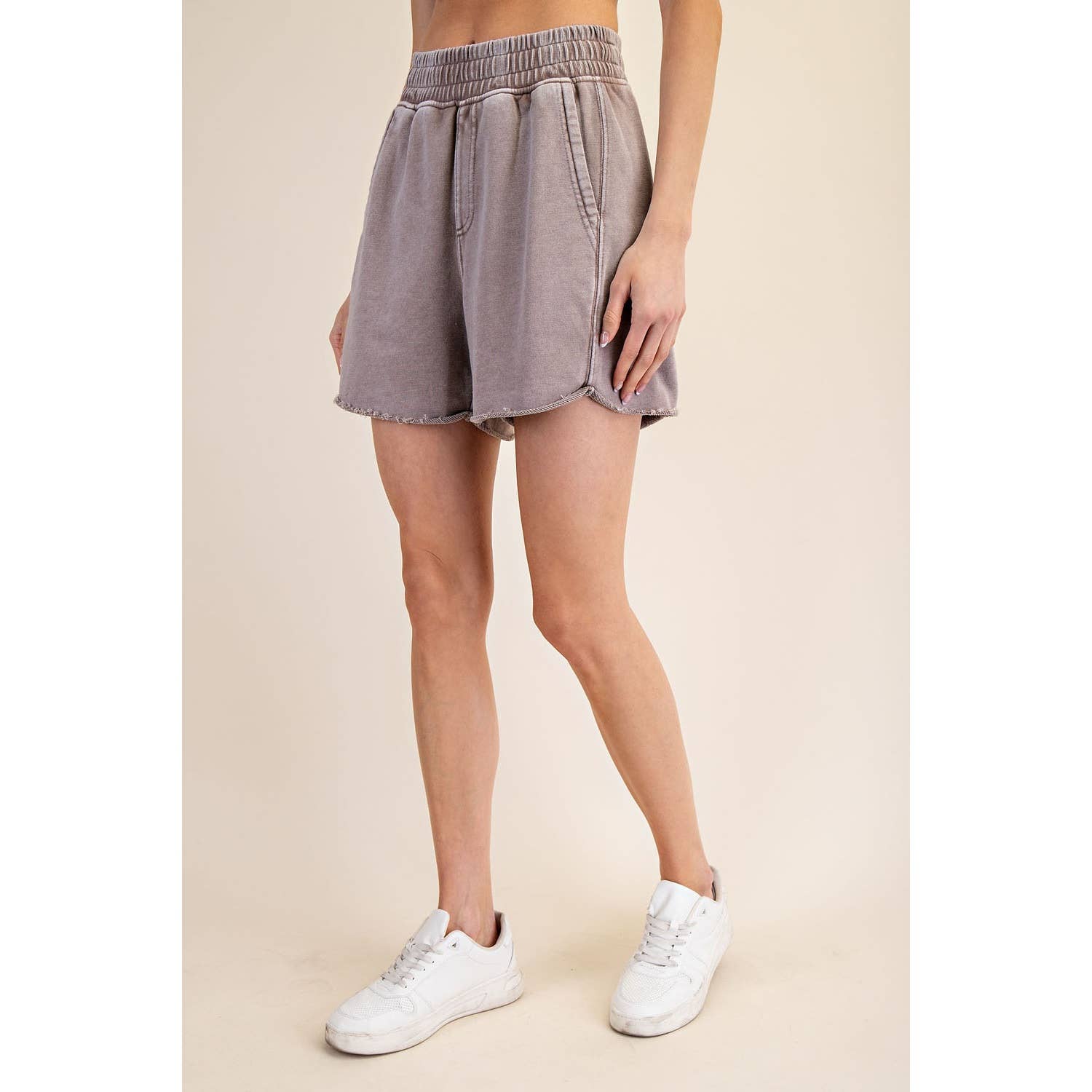 - Mineral-washed French terry shorts featuring a soft, lived-in feel, an elastic waistband, and side pockets for everyday comfort and style. Perfect for lounging or casual outings. Features: - Mineral washed French terry fabric - Relaxed fit - High rise / High waist - Mid-thigh length - Exposed seam details - Elastic waistband - Side pockets Model is 5'8" and wearing size Small. Fabric: 60% Cotton, 40% Polyester / Rib: 57% Cotton, 38% Polyester, 5% Spandex C.O.O: Import