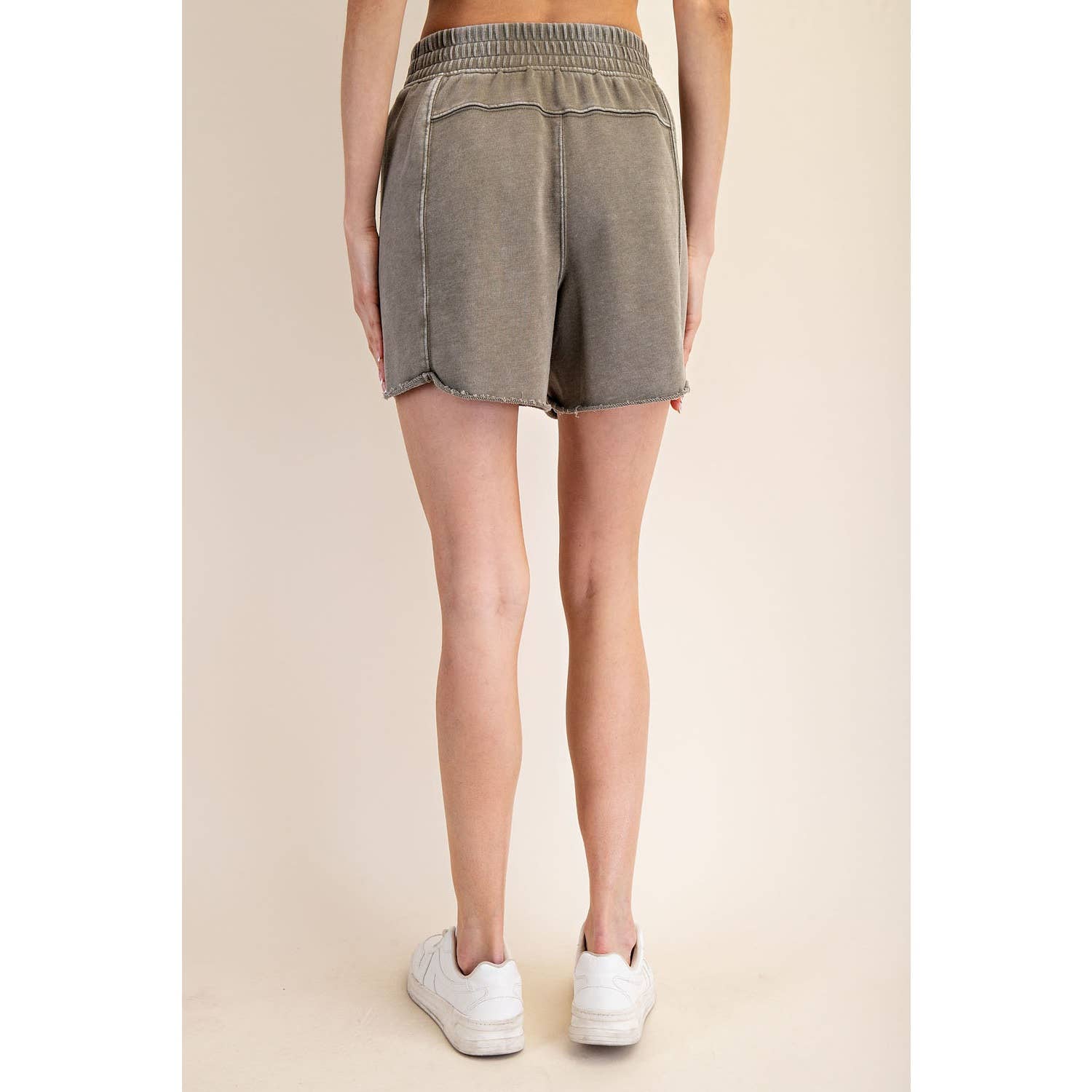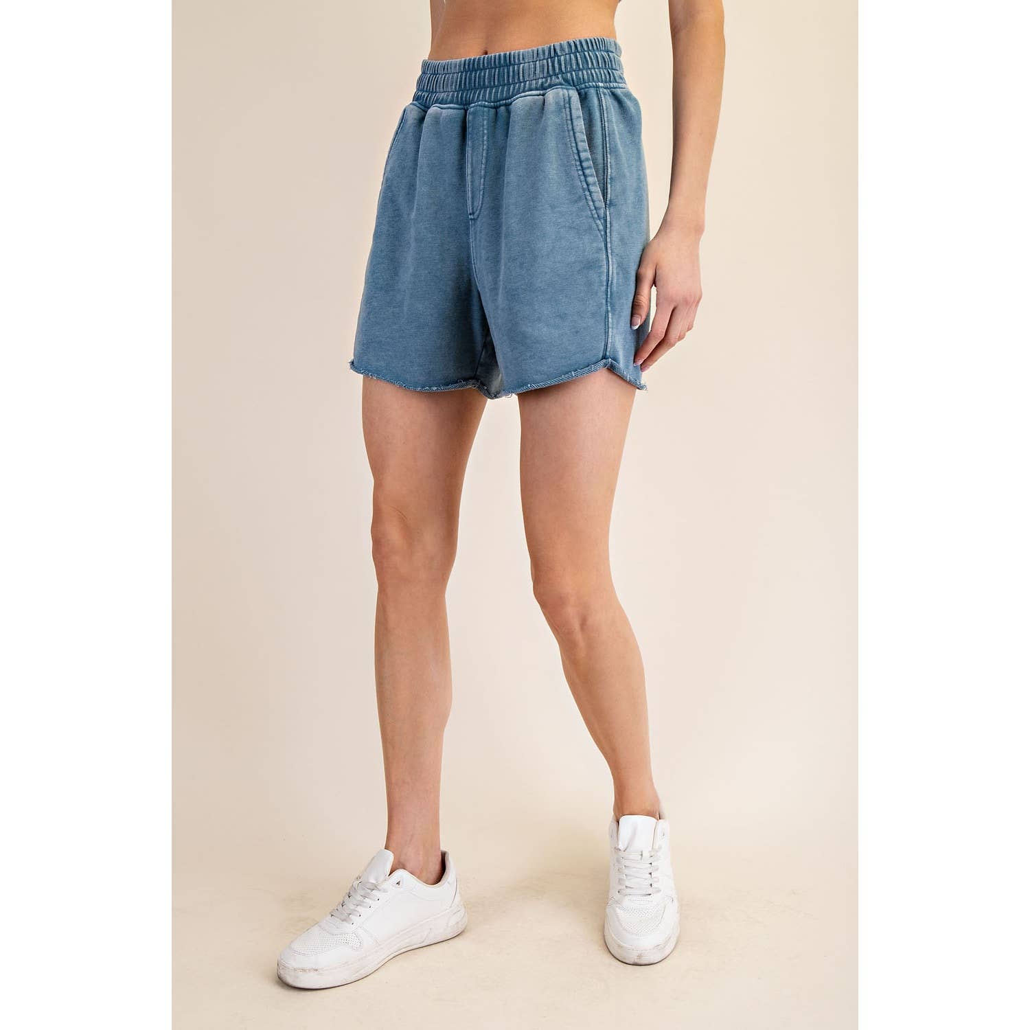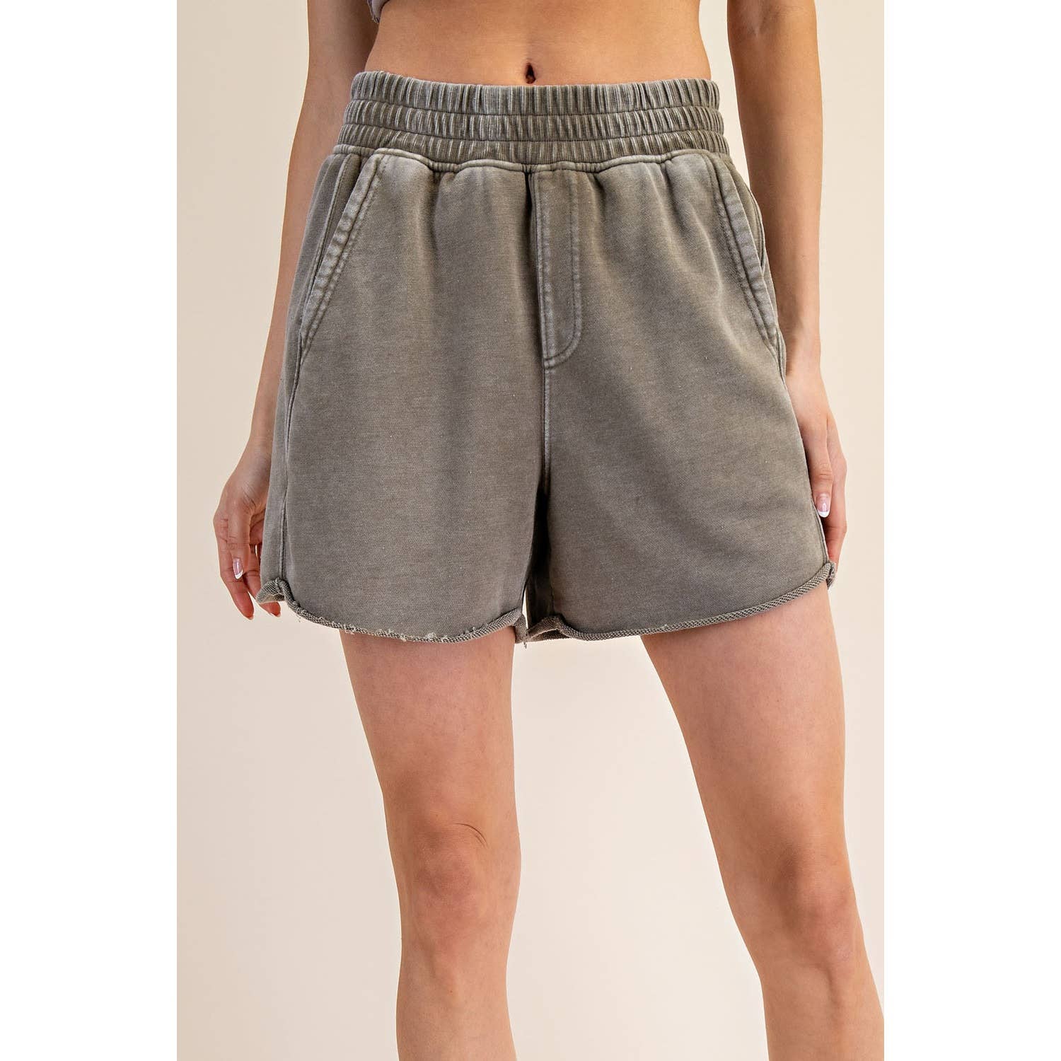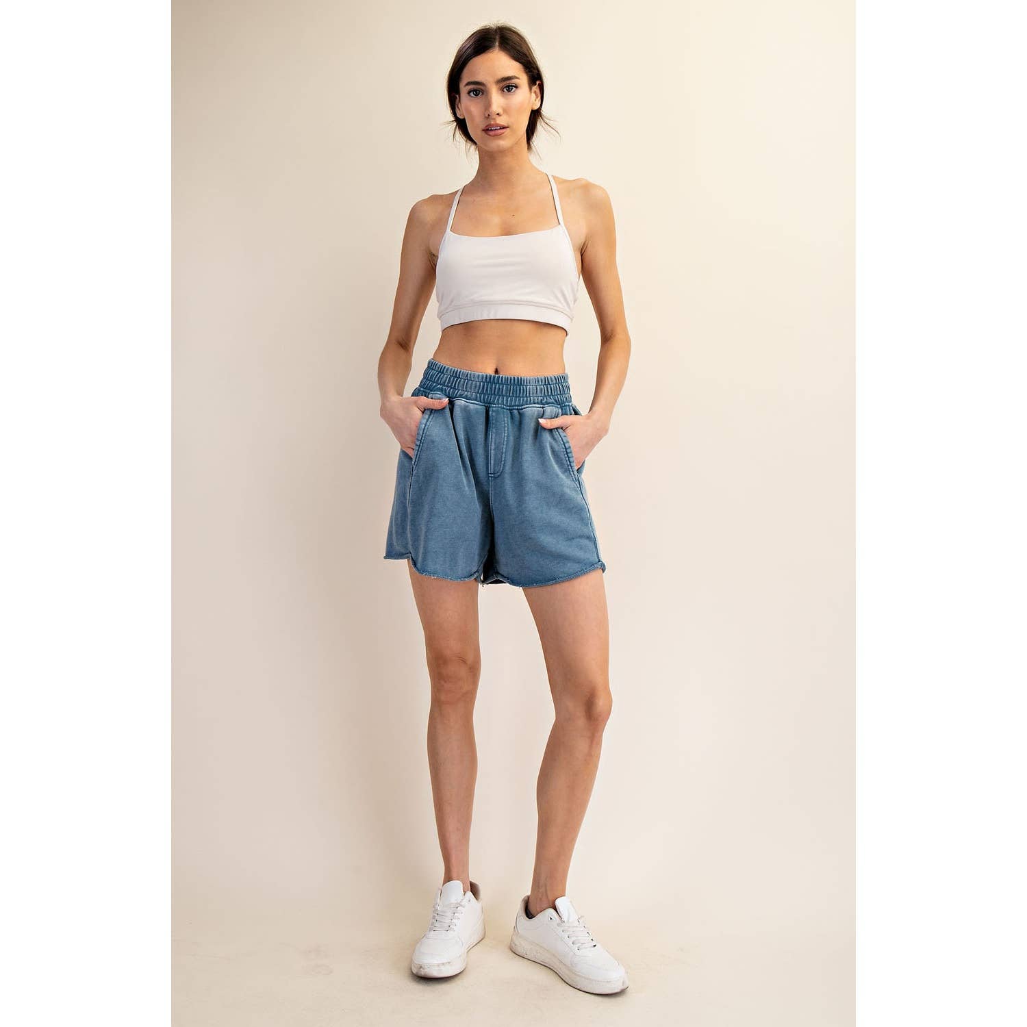 - Mineral-washed French terry shorts featuring a soft, lived-in feel, an elastic waistband, and side pockets for everyday comfort and style. Perfect for lounging or casual outings. Features: - Mineral washed French terry fabric - Relaxed fit - High rise / High waist - Mid-thigh length - Exposed seam details - Elastic waistband - Side pockets Model is 5'8" and wearing size Small. Fabric: 60% Cotton, 40% Polyester / Rib: 57% Cotton, 38% Polyester, 5% Spandex C.O.O: Import