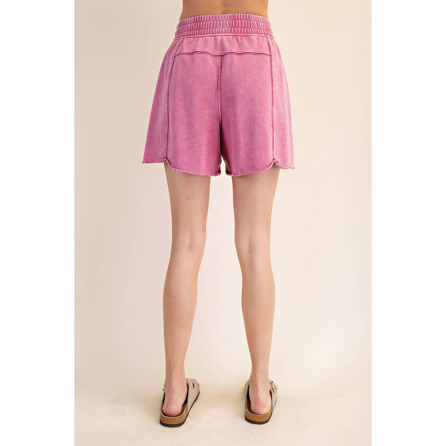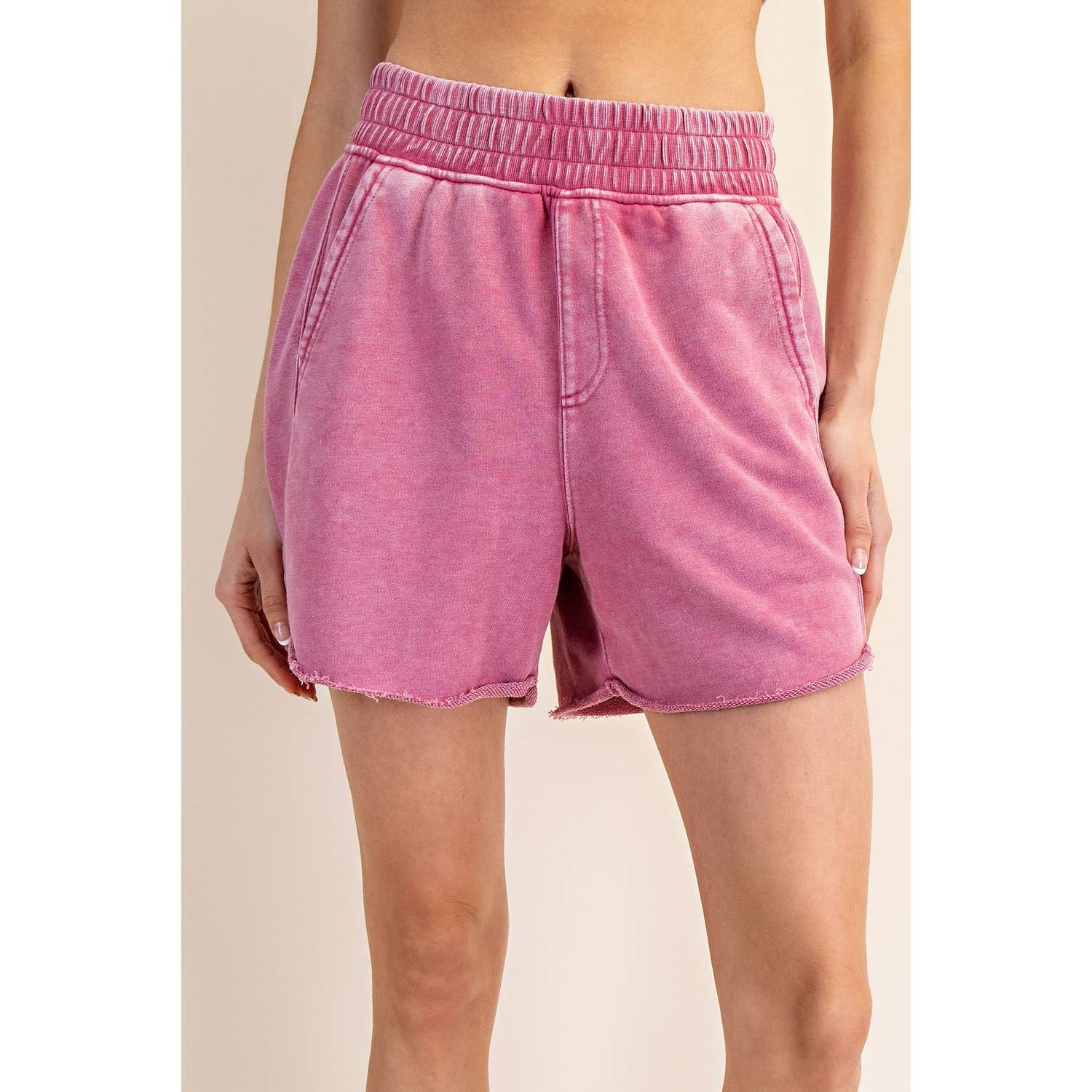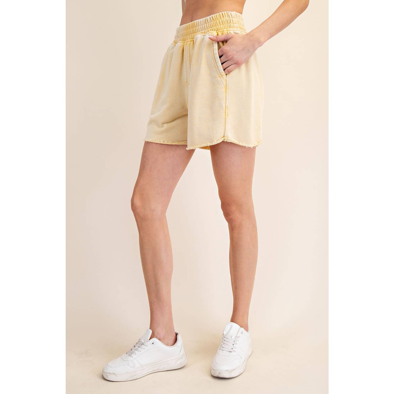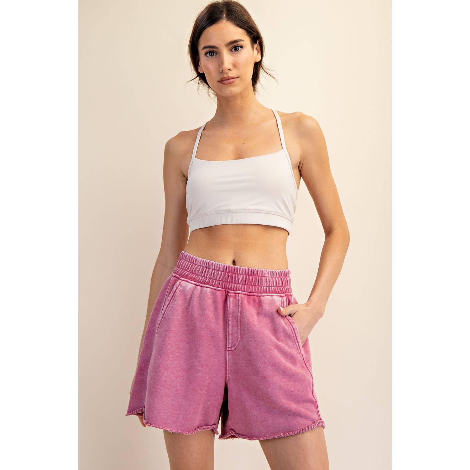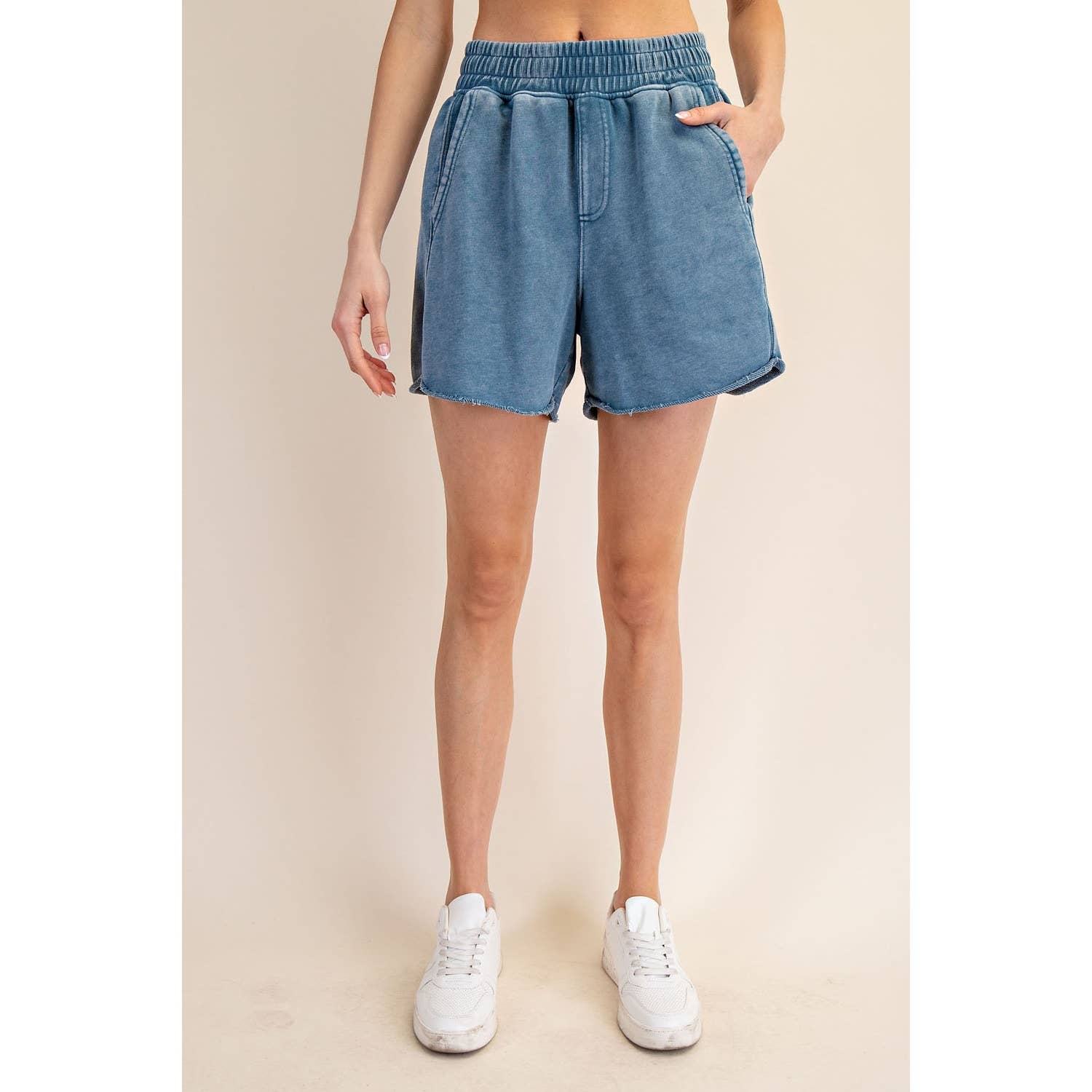 - Mineral-washed French terry shorts featuring a soft, lived-in feel, an elastic waistband, and side pockets for everyday comfort and style. Perfect for lounging or casual outings. Features: - Mineral washed French terry fabric - Relaxed fit - High rise / High waist - Mid-thigh length - Exposed seam details - Elastic waistband - Side pockets Model is 5'8" and wearing size Small. Fabric: 60% Cotton, 40% Polyester / Rib: 57% Cotton, 38% Polyester, 5% Spandex C.O.O: Import