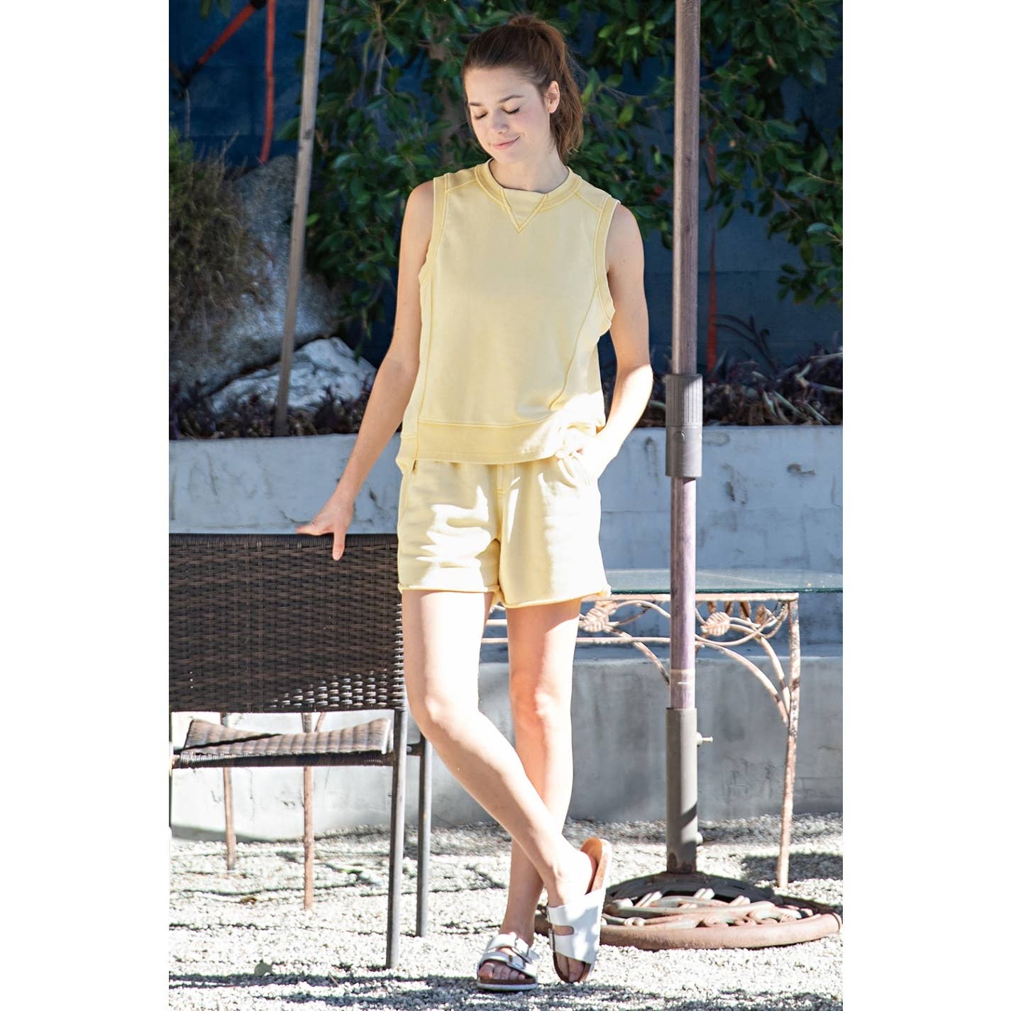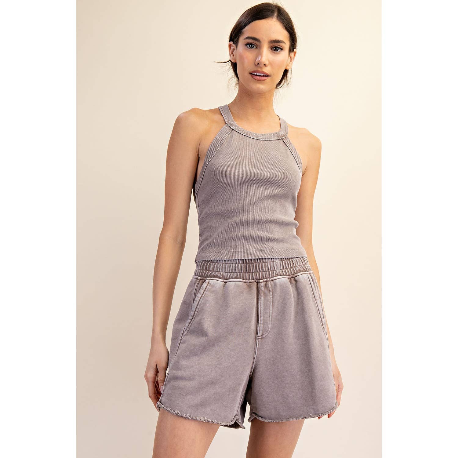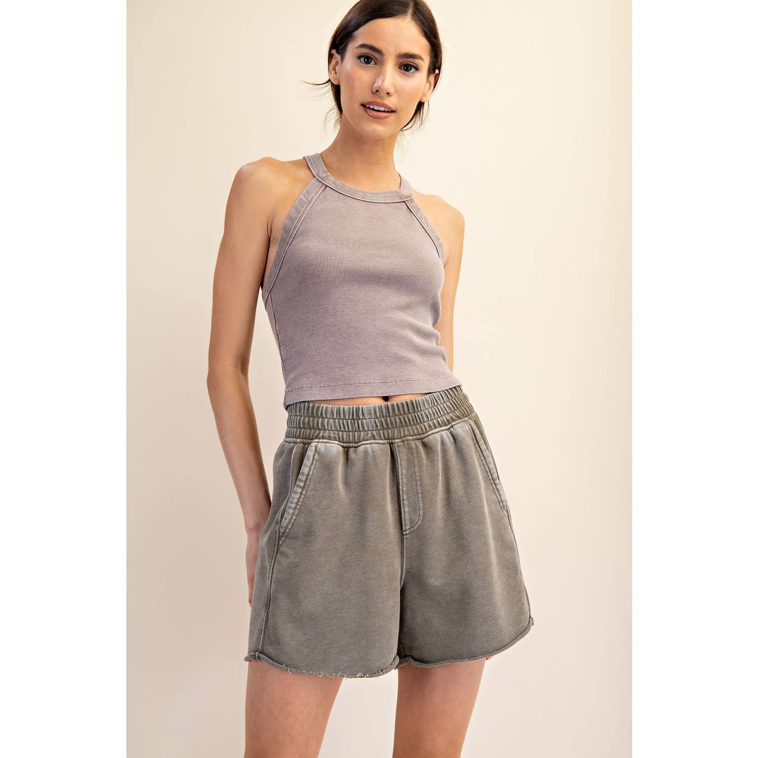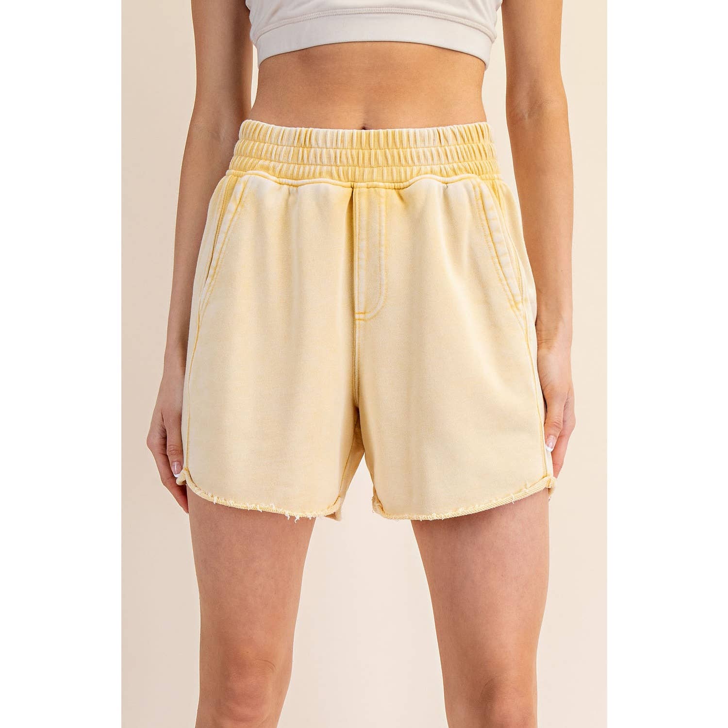 - Mineral-washed French terry shorts featuring a soft, lived-in feel, an elastic waistband, and side pockets for everyday comfort and style. Perfect for lounging or casual outings. Features: - Mineral washed French terry fabric - Relaxed fit - High rise / High waist - Mid-thigh length - Exposed seam details - Elastic waistband - Side pockets Model is 5'8" and wearing size Small. Fabric: 60% Cotton, 40% Polyester / Rib: 57% Cotton, 38% Polyester, 5% Spandex C.O.O: Import