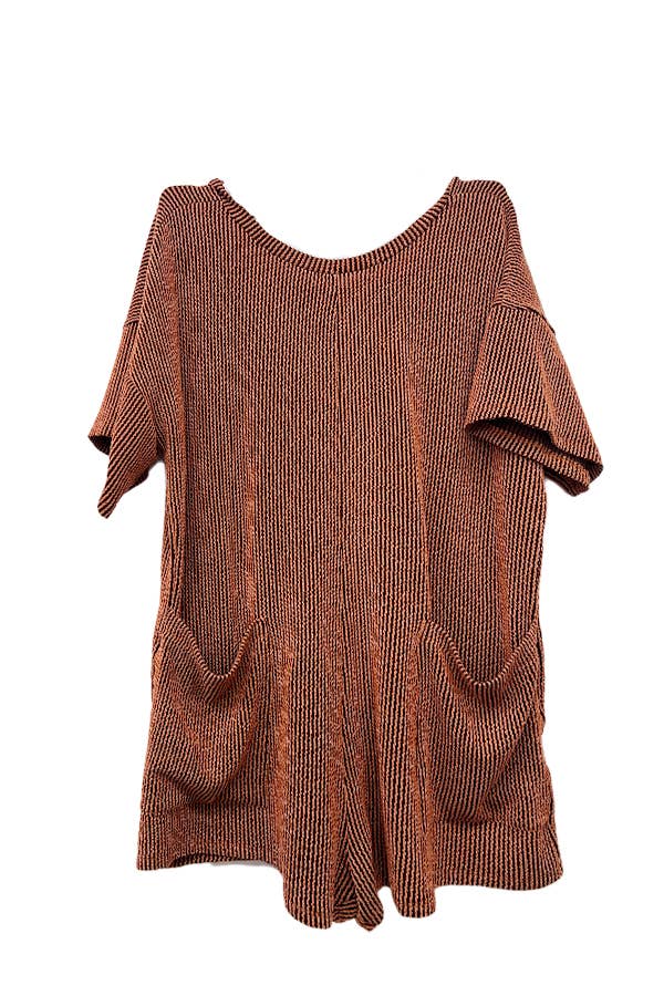 Crew Neckline V-back Oversized Ribbed Romper - Soft solid stretch fabric - Half length sleeve - Drop shoulder - V line back - Front out pockets - Oversized silhouette