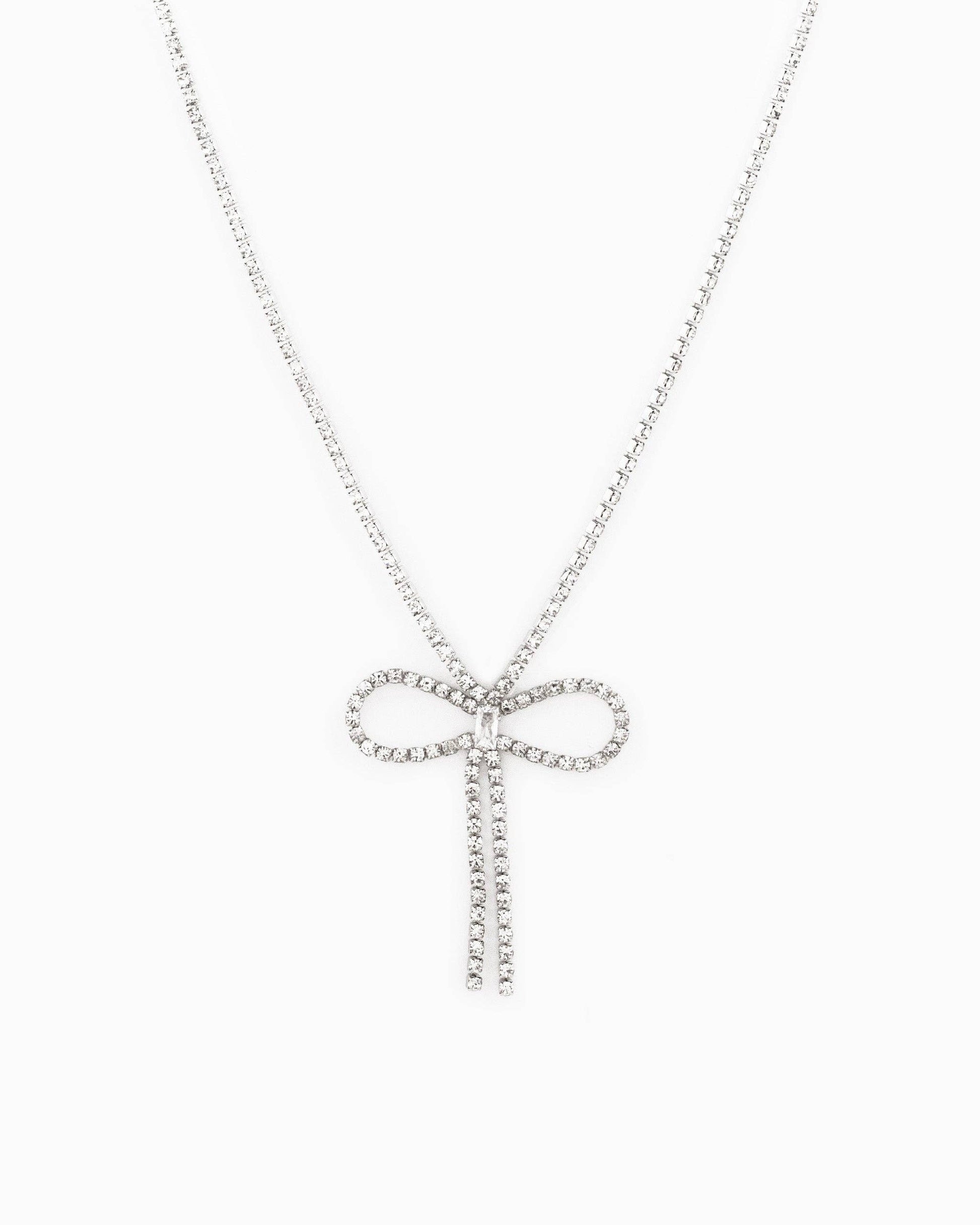 A fancy rhinestone bow necklace with an extra spark in the middle, this symmetrical ribbon necklace is available in a silver finish. Spark your customer's interest with this shiny bow necklace.