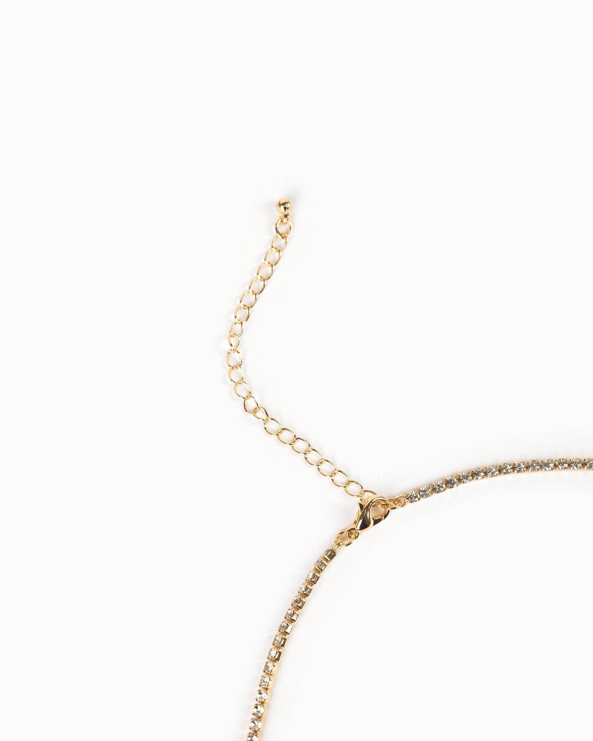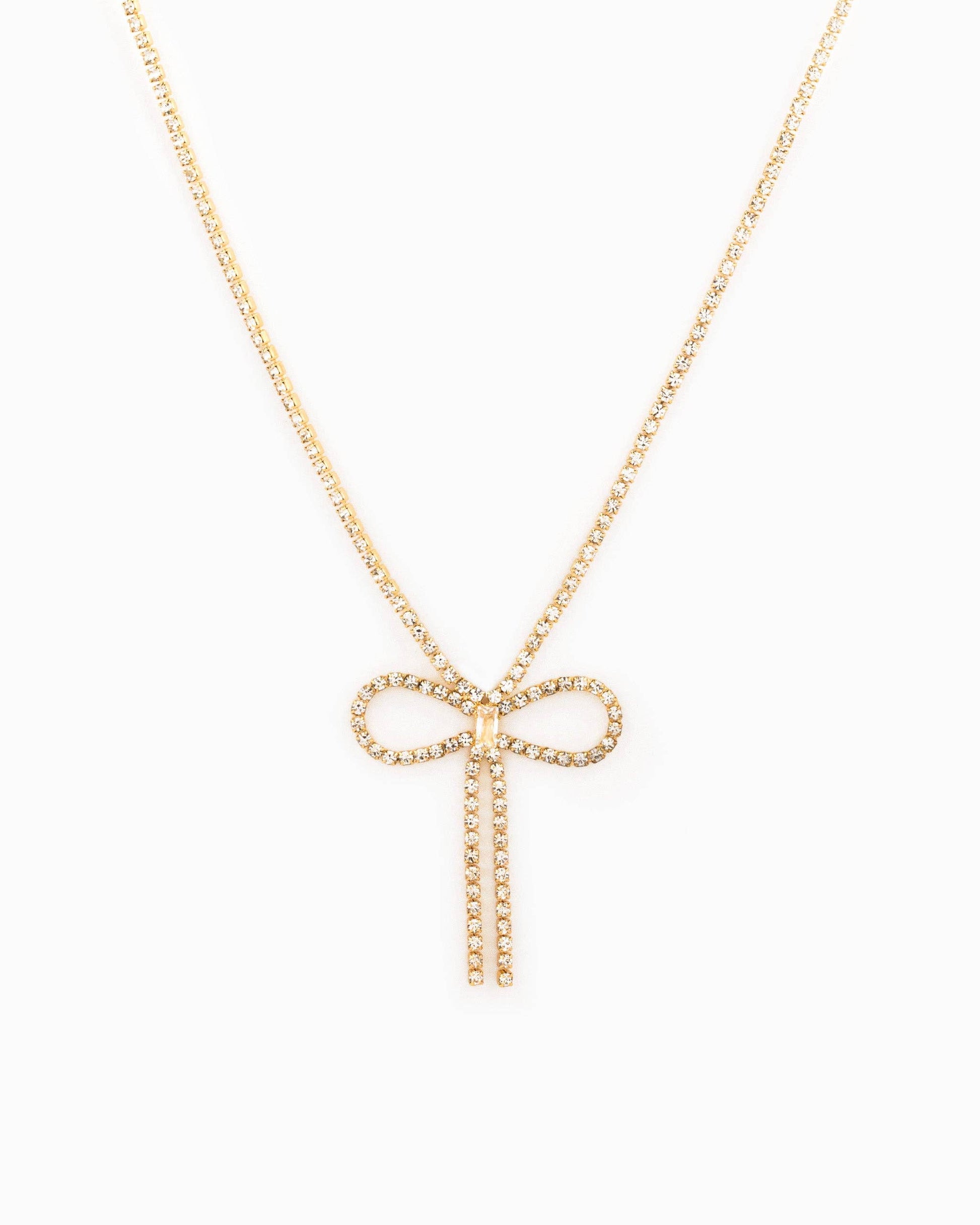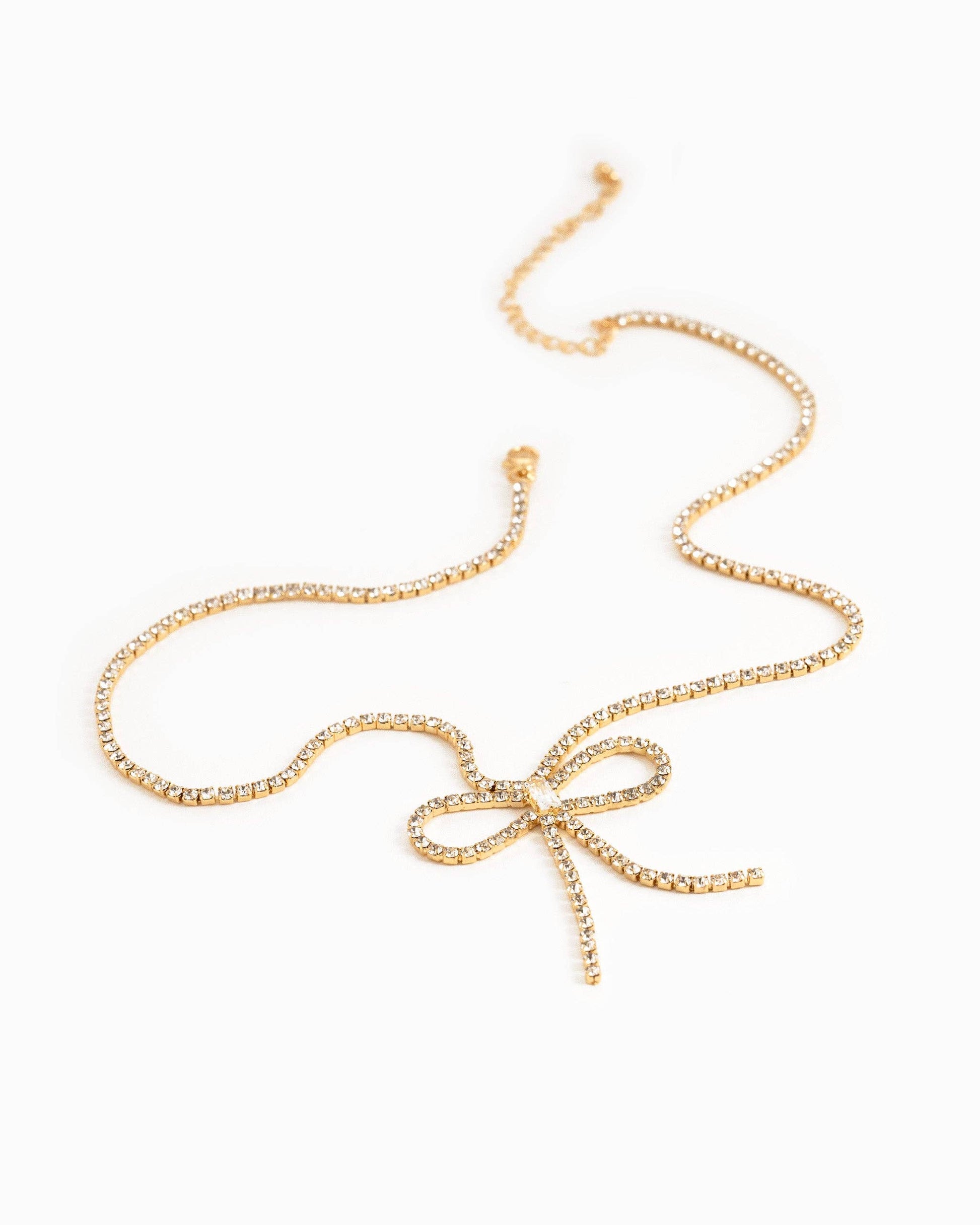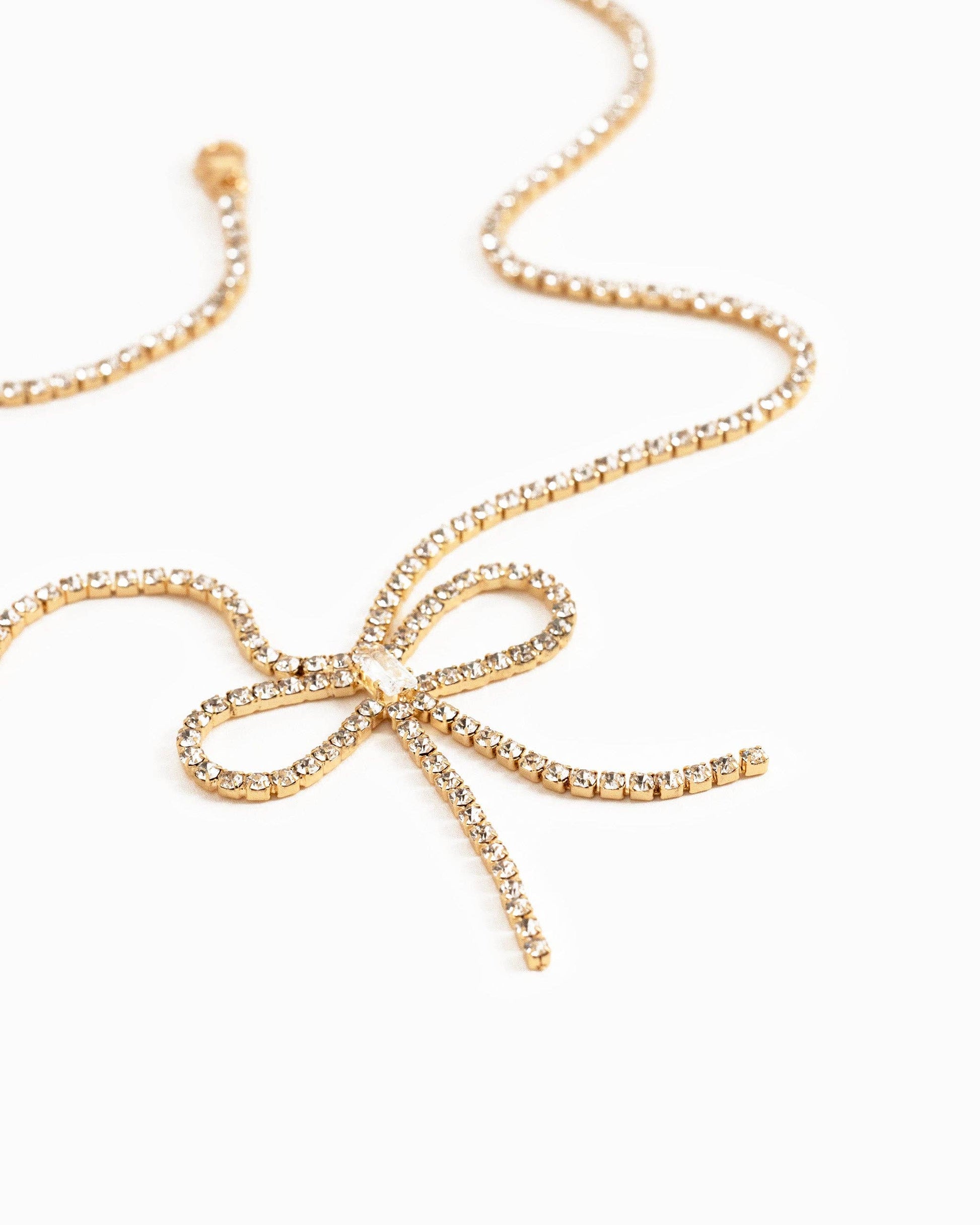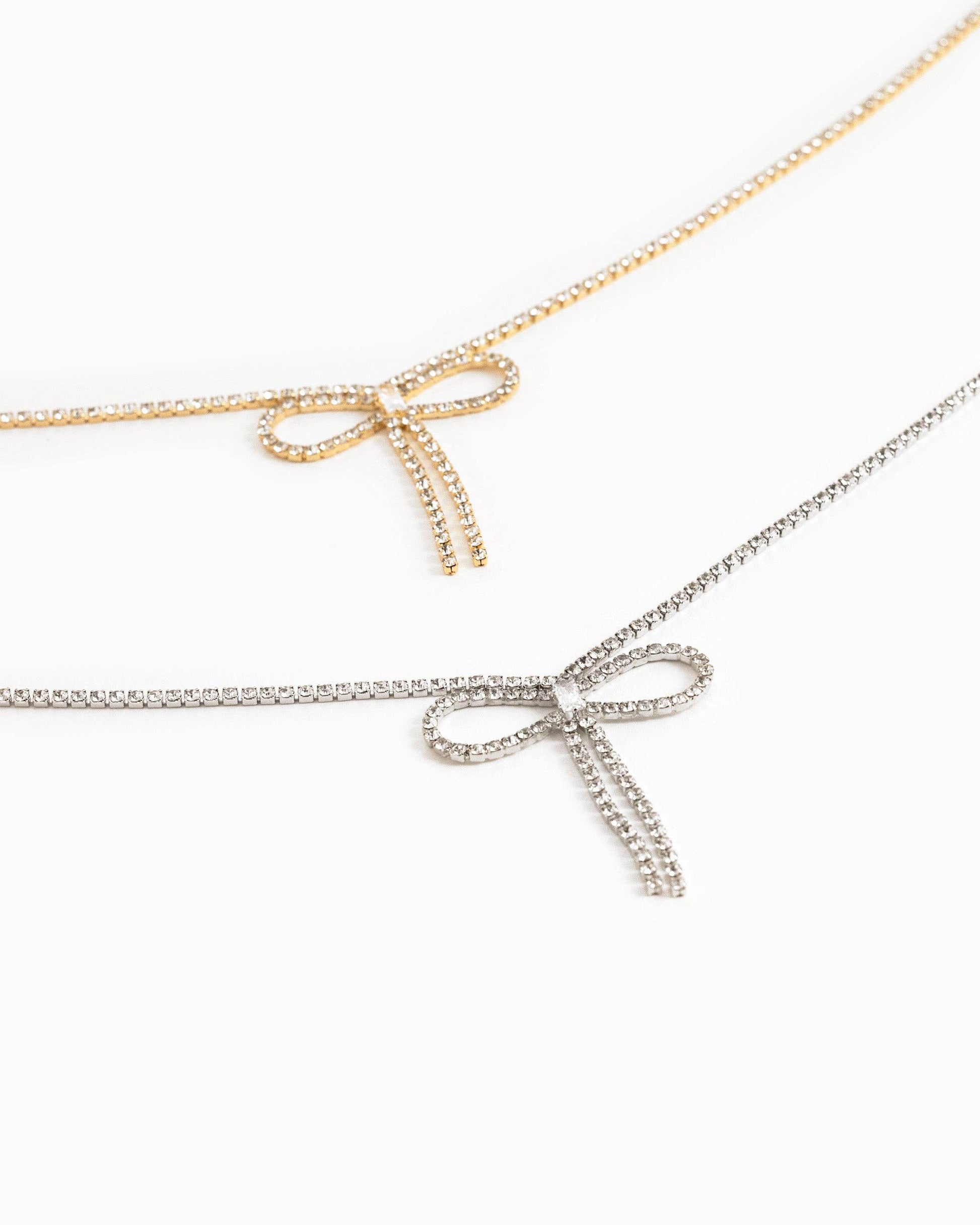 Rhinestone Chain Symmetrical Bow Necklace w/ Baguette CZ
