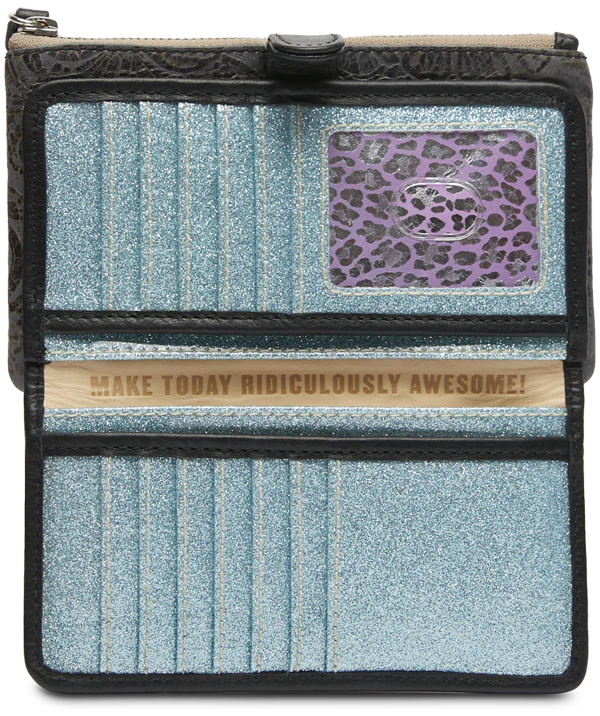 - 12 card slots, ID window, and 4 slide pocket compartments with snap closure