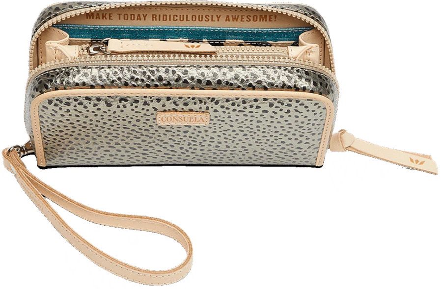 - 12 card slots, gusseted compartments, zipper pocket, and 2 open pocket compartments