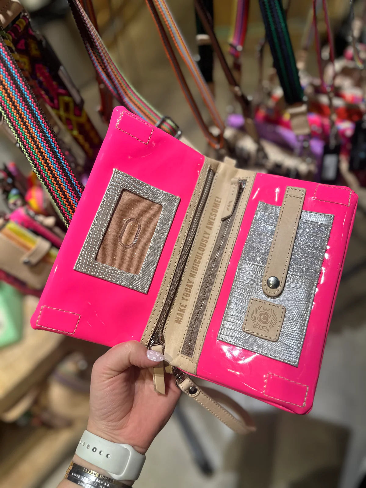 - Included detachable wristlet strap and adjustable woven crossbody strap